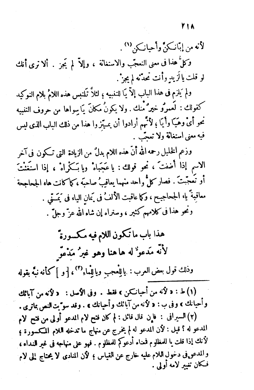 وزعم الخليل رحمه الله أن هذه اللام بدلٌ من الزيادة التي تكون في آخر الاسم إذا أضفتَ، نحو قولك: يا عجَباه ويا بَكراه، إذا استغثتَ أو تعجبت. فصار كلُ واحد منهما يعاقب صاحبَه، كما كانت هاء الجحاجحة معاقبة ياء الجحاجيح، وكما عاقبت الألف في يمانٍ الياء في يَمَني.