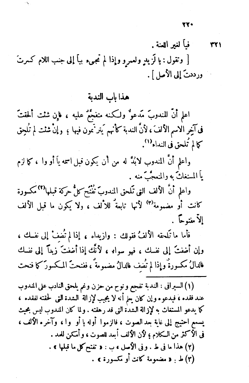 واعلم أن المندوب لابد له من أن يكون قبل اسمه يا أو وا، كما لزم يا المستغاثَ به والمتعجَّبَ منه.
