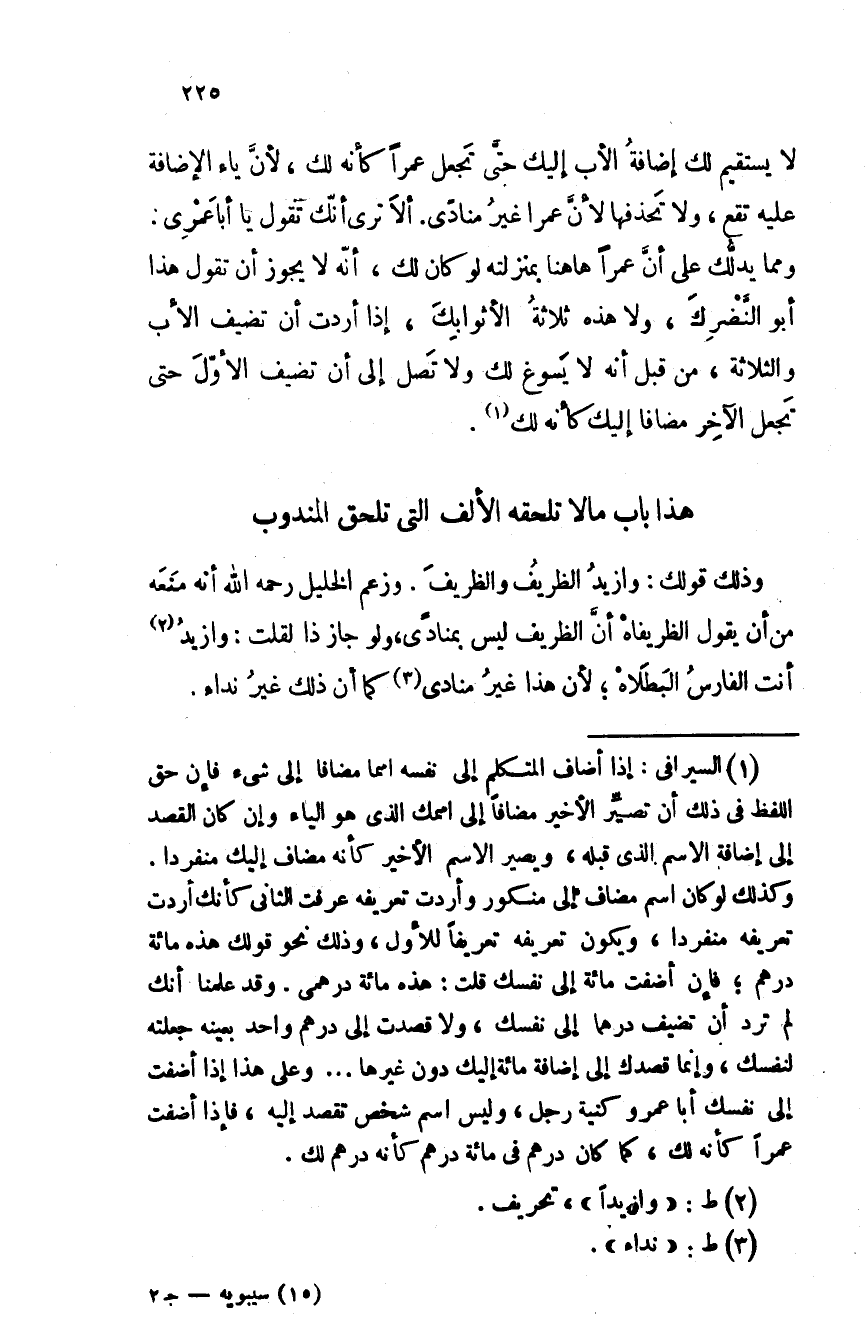 وذلك قولك: وازيدُ الظريفُ والظريفَ. وزعم الخليل رحمه الله أنه منعه من أن يقول الظريفاه أن الظريف ليس بمنادى، ولو جاز ذا لقلت: وازيدُ أنت الفارسُ البَطَلاهْ؛ لأن هذا غير منادى كما أن ذلك غير نداء.