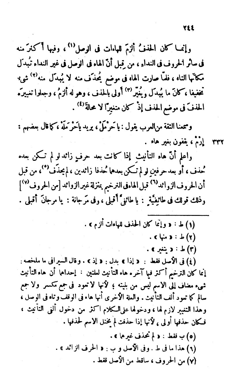 وإنما كان الحذف ألزمَ للهاءات في الوصل، وفيها أكثر منه في سائر الحروف في النداء، من قبل أن الهاء في الوصل في غير النداء تبدل مكانَها التاء، فلما صارت الهاء في موضع يحذف منه لا يُبدّل منه شيء تخفيفا، كان ما يُبدّل ويُغيّر أولى بالحذف، وهو له ألزم، وجعلوا تغييره الحذف في موضع الحذف إذ كان متغيرا لا محالة.