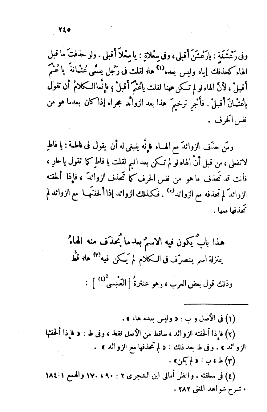 وفي رعشنةٍ: يا رَعْشَنَ أقبلى، وفي سِعلاةٍ: يا سِعلا أقبلى. ولو حذفتَ ما قبل الهاء كحذفك إياه وليس بعده هاء لقلت في رجل يسمى عُثمانةَ يا عُثمَ أقبل، لأن الهاء لو لم تكن ههنا لقلت يا عُثْمَ أقبل؛ فإنما الكلام أن تقول يا عُثمان أقبل. فأجْرِ ترخيمَ هذا بعد الزوائد مجراه إذا كان بعدما هو من نفس الحرف.