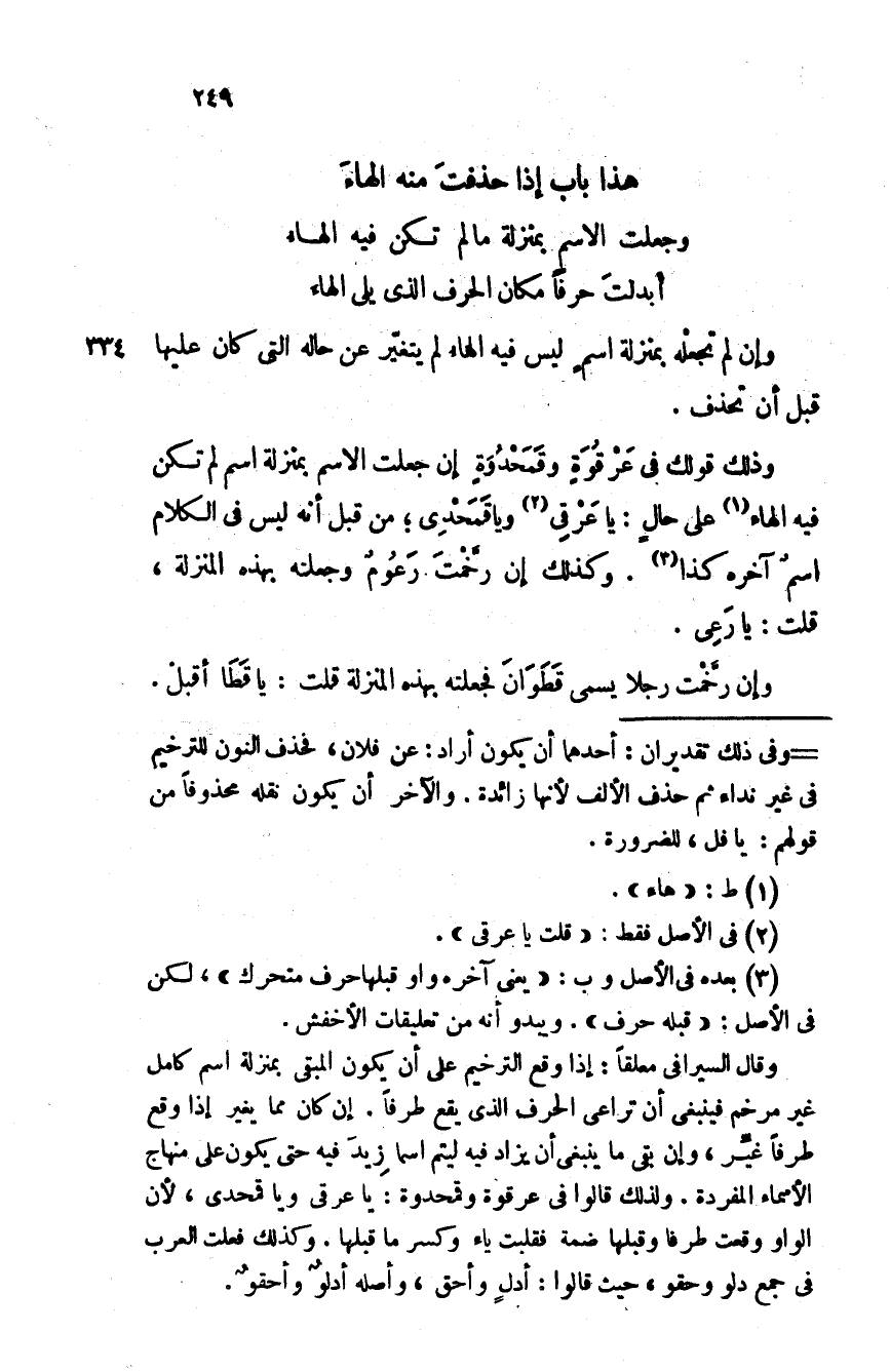 وذلك قولك في عَرقوةٍ وقَمَحدوَةٍ وإن جعلت الاسم بمنزلة اسم لم تكن فيه الهاء على حالٍ: يا عَرقي ويا قَمَحْدي؛ من قبل أنه ليس في الكلام اسمٌ آخر كذا. وكذلك إن رخّمتَ رَعومٌ وجعلته بهذه المنزلة، قلت يا رَعي.