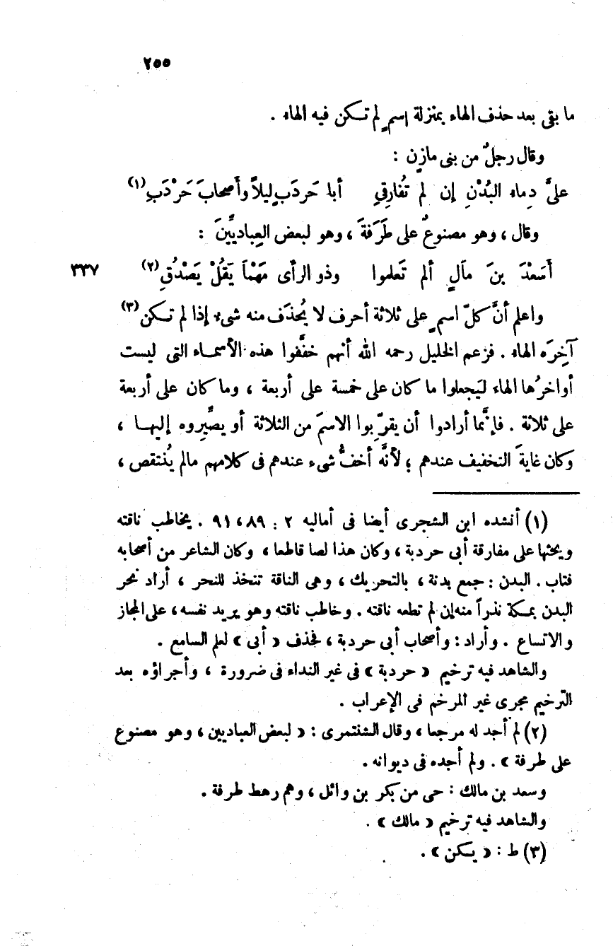 واعلم أن كل اسم على ثلاثة أحرف لا يحذف منه شيء إذا لم تكن آخره الهاء. فزعم الخليل رحمه الله أنهم خففوا هذه الأسماء التي ليست أواخرها الهاء ليجعلوا ما كان على خمسة على أربعة، وما كان على أربعة على ثلاثة. فإنما أرادوا أن يقربوا الاسم من الثلاثة أو يصيروه إليها، وكان غاية التخفيف عندهم؛ لأنه أخف شيء عندهم في كلامهم ما لم يُنتقص،