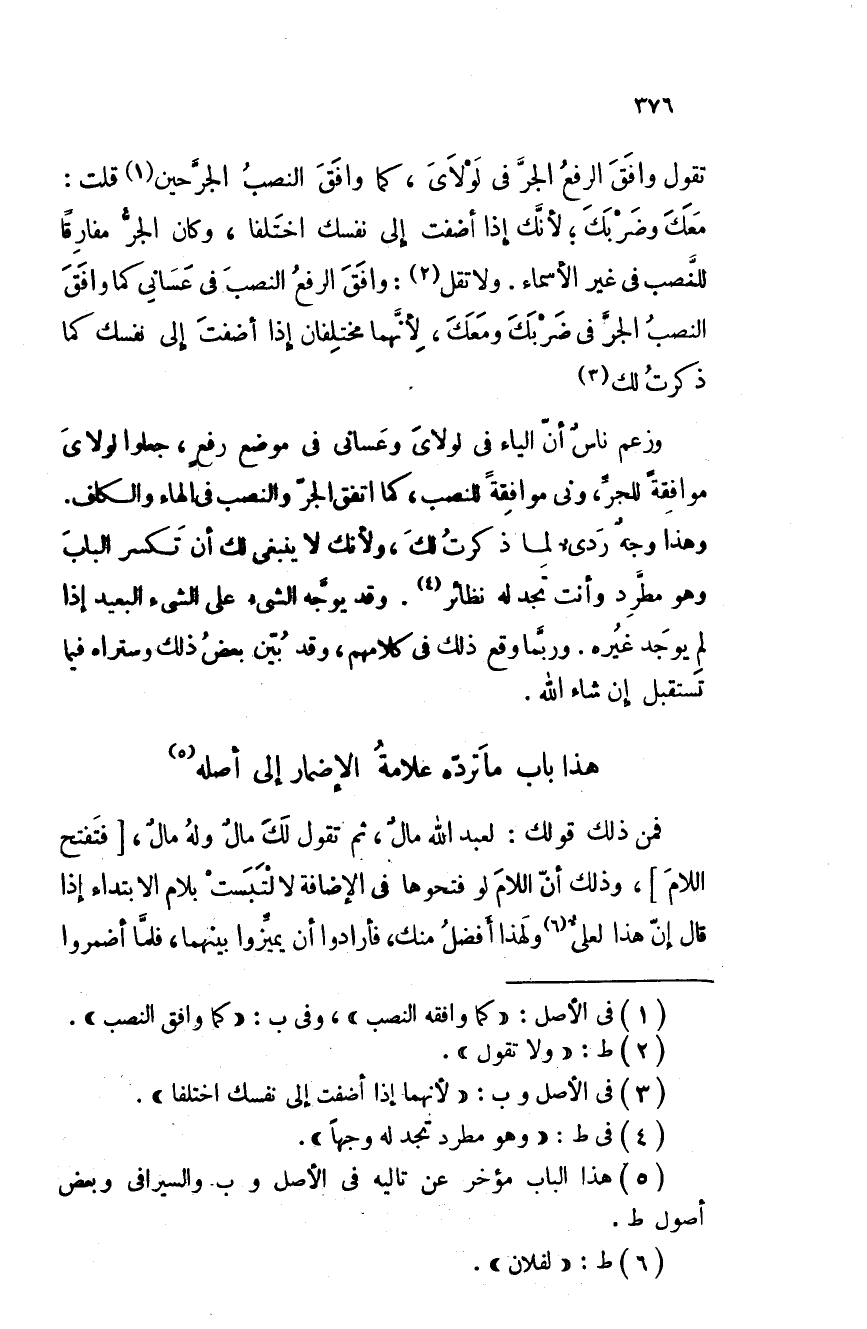 وإنما اختير الوجهُ الذي تثبَت فيه النون في هذا الباب كما اختير في كم إذا قلت كم بها رجلا مصابا، وأنت تُخبر، لغة من ينصب بها، لئلا يفصَل بين الجار والمجرور: ومن قال: كم بها رجل مصاب فلم يُبالِ القبح قال: لا يَدَيْ بها لك، ولا أخا يوم الجمعة لك، ولا أخا فاعلم لك.