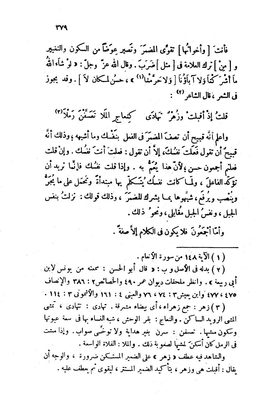 واعلم أن المنفي الواحد إذا لم يك لك فإنما يُذهب منه التنوين كما أُذهب من آخر خمسة عشر، كما أُذهب من المضاف. والدليل على ذلك أن العرب تقول: لا غلامين عندك، ولا غلامين فيها، ولا أبَ فيها؛ وأثبتوا النون لأن النون لا تُحذف من الاسم الذي يُجعل وما قبله أو وما بعده بمنزلة اسم واحد. ألا تراهم قالوا: الذين في الدار، فجعلوا الذين وما بعده من الكلام بمنزلة اسمين جُعلا اسما واحدا، ولم يحذفوا النون لأنها لا تجيء على حد التنوين. ألا تراها تدخل في الألف واللام وما لا ينصرف.