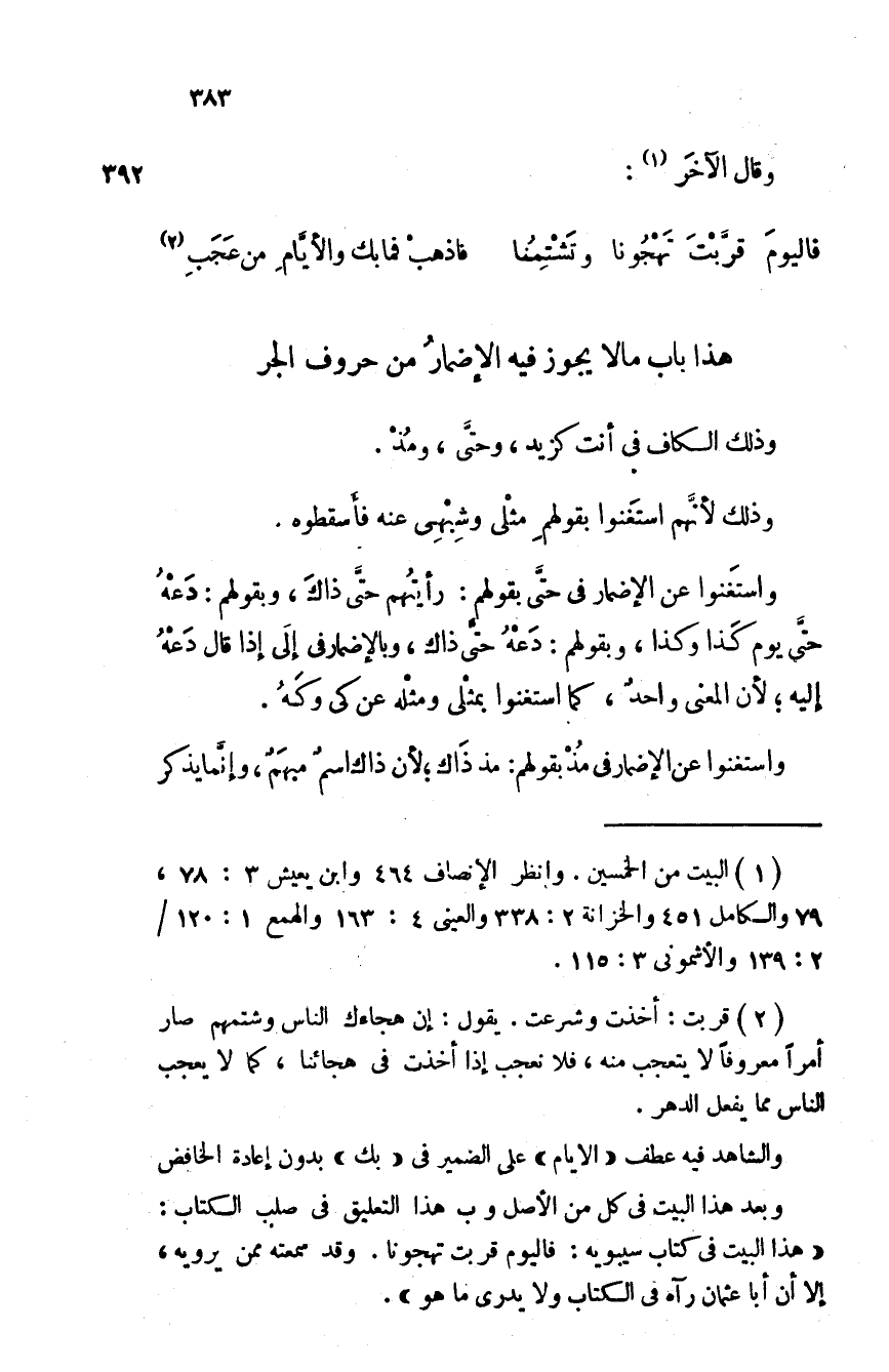 وذلك من قبل أن التنوين لم يصر منتهى الاسم، فصار كأنه حرف قبل آخر الاسم، وإنما يُحذف في النفى والنداء منتهى الاسم. وهو قولك: لا خيرا منه لك، ولا حسَناً وجهُه لك، ولا ضاربا زيدا لك؛ لأن ما بعد حسنٍ وضاربٍ وخيرٍ صار من تمام الاسم فقبح عندهم أن يحذفوا قبل أن ينتهوا إلى منتهى الاسم؛ لأن الحذف في النفى في أواخر الأسماء. ومثل ذلك قولك: لا عشرين درهما لك.