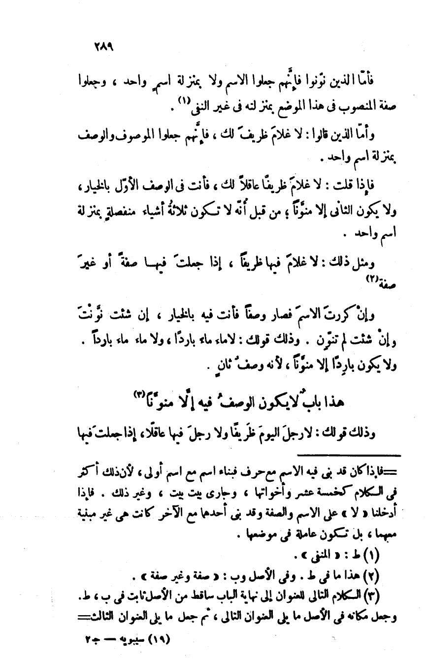 فأما الذين نونوا فإنهم جعلوا الاسم ولا بمنزلة اسم واحد، وجعلوا صفة المنصوب في هذا الموضع بمنزلته في غير النفى.