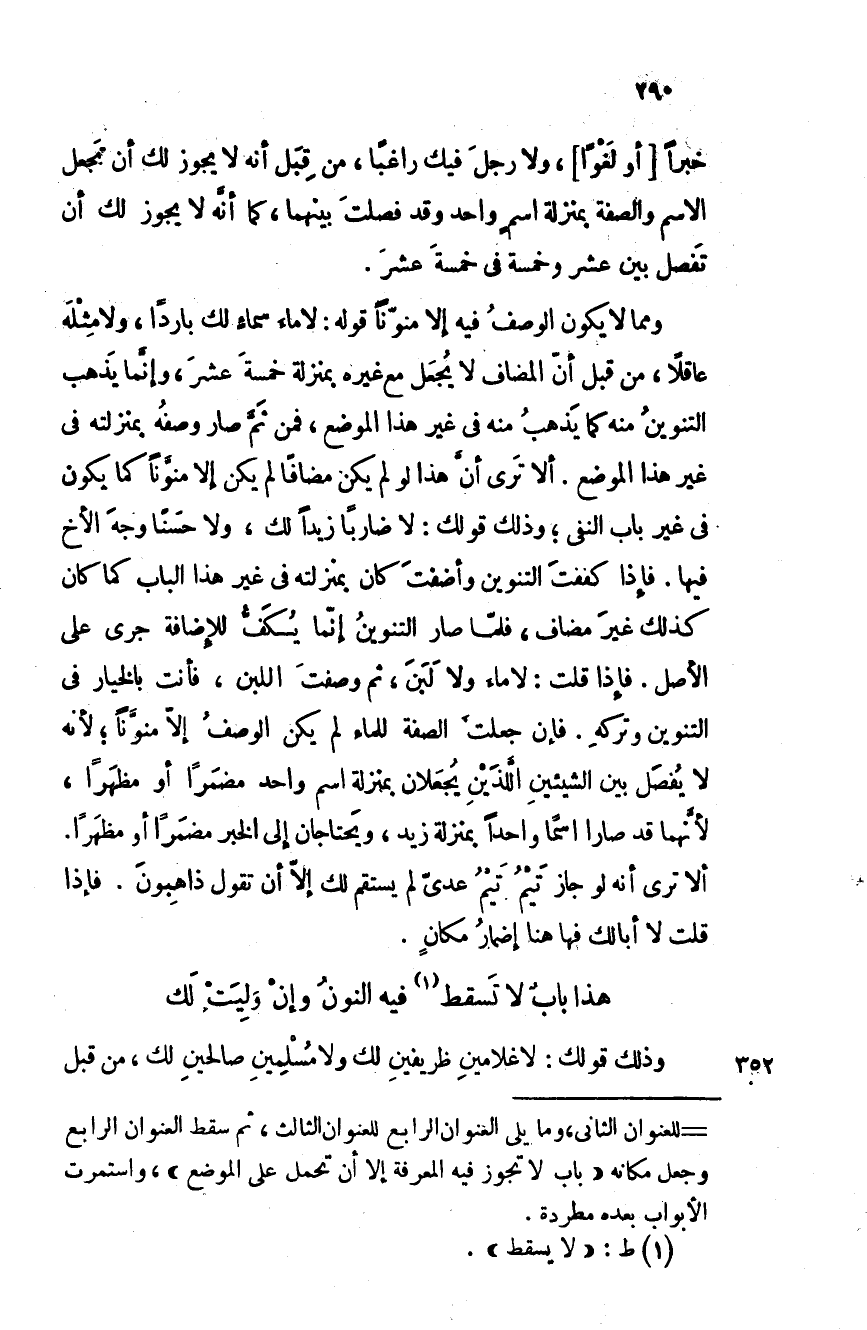ومما لا يكون الوصفُ فيه إلا منونا قوله: لا ماء سماءٍ لك باردا، ولا مثلَه عاقلا، من قبل أن المضاف لا يُجعل مع غيره بمنزلة خمسة عشر، وإنما يذبه التنوين منه كما يذهب منه في غير هذا الموضع، فمن ثم صار وصفُه بمنزلته في غير هذا الموضع. ألا ترى أن هذا لو لم يكن مضافا لم يكن إلا منونا كما يكون في غير باب النفى؛ وذلك قولك: لا ضاربا زيدا لك، ولا حسنا وجهَ الأخ فيها. فإذا كففتَ التنوين وأضفت كا بمنزلته في غير هذا الباب كما كان كذلك غيرَ مضاف، فلما صار التنوين إنما يُكَفّ للإضافة جرى على الأصل. فإذا قلت: لا ماءَ ولا لبنَ، ثم وصفت اللبن، فأنت بالخيار في التنوين وتركه. فإذا جعلت الصفة للماء لم يكن الوصفُ إلا منونا؛ لأنه لا يُفصَل بين الشيئين اللذين يجعلان بمنزلة اسم واحد مضمَراً أو مظهَراً، لأنهما قد صارا اسما واحدا بمنزلة زيد، ويحتاجان إلى الخبر مضمَراً أو مظهَراً. ألا ترى أنه لو جاز تَيمُ تيمُ عدى لم يستقم إلا أن تقول ذاهبون. فإذا قلت لا أبا لك فها هنا إضمار مكان.