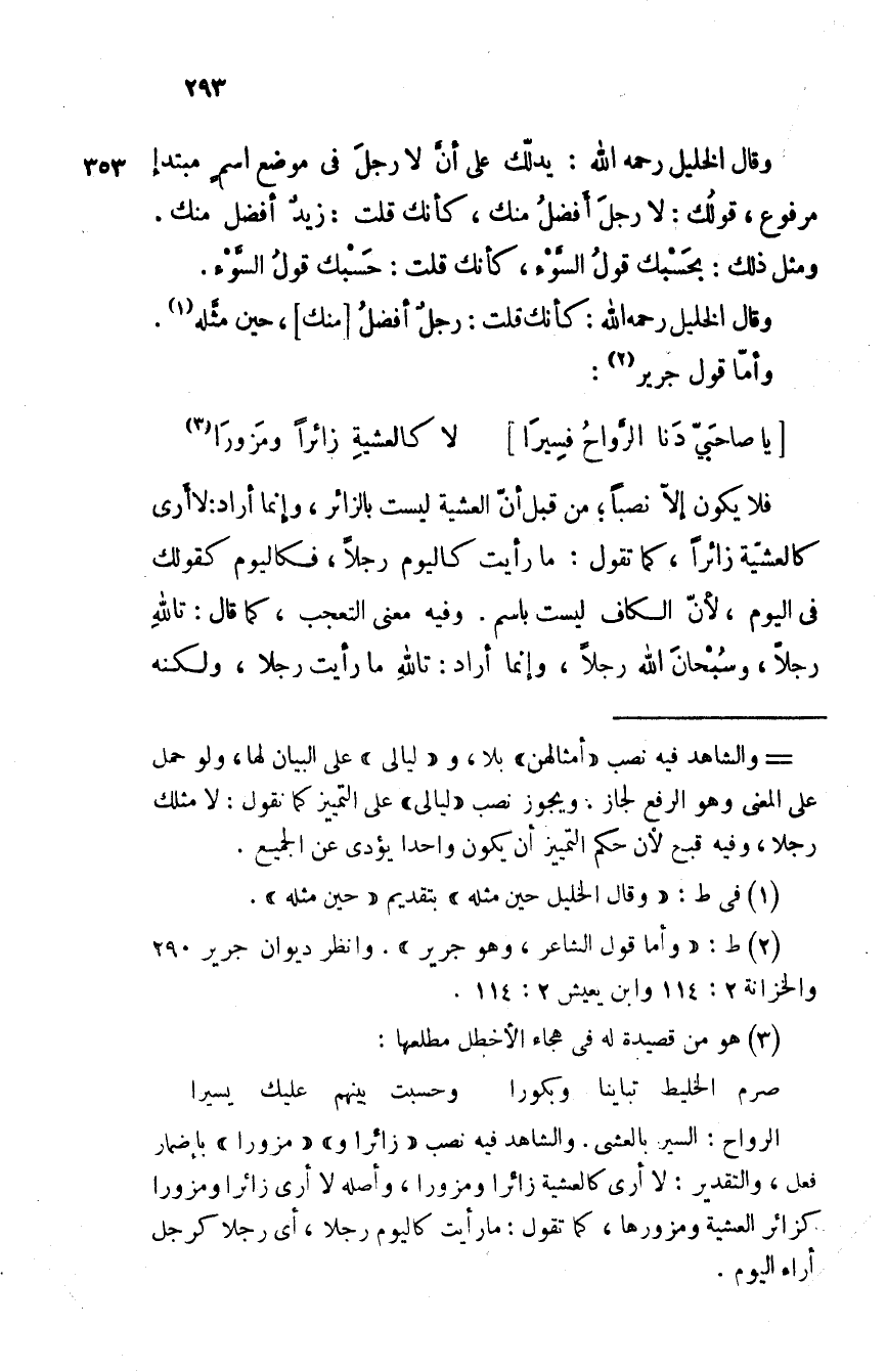 وقال الخليل رحمه الله: يدلك على أن لا رجلَ في موضع اسم مبتدإ مرفوع، قولك: لا رجلَ أفضلُ منك، كأنك قلت: زيدٌ أفضل منك. ومثل ذلك: بحَسبك قول السّوْء، كأنك قلت: حسبك قولُ السّوْء.