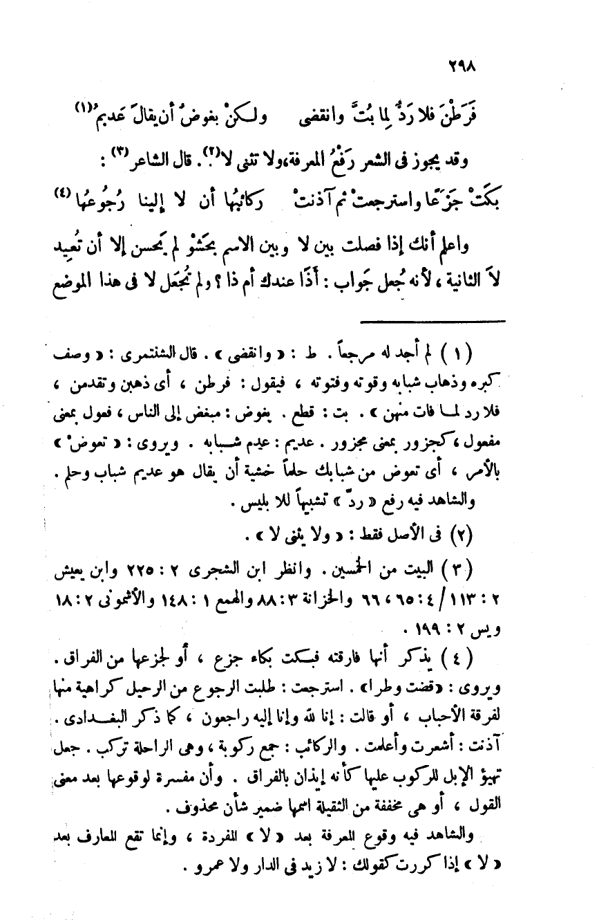 وقد يجوز في الشعر رفع المعرفة، ولا تثنى لا. قال الشاعر: