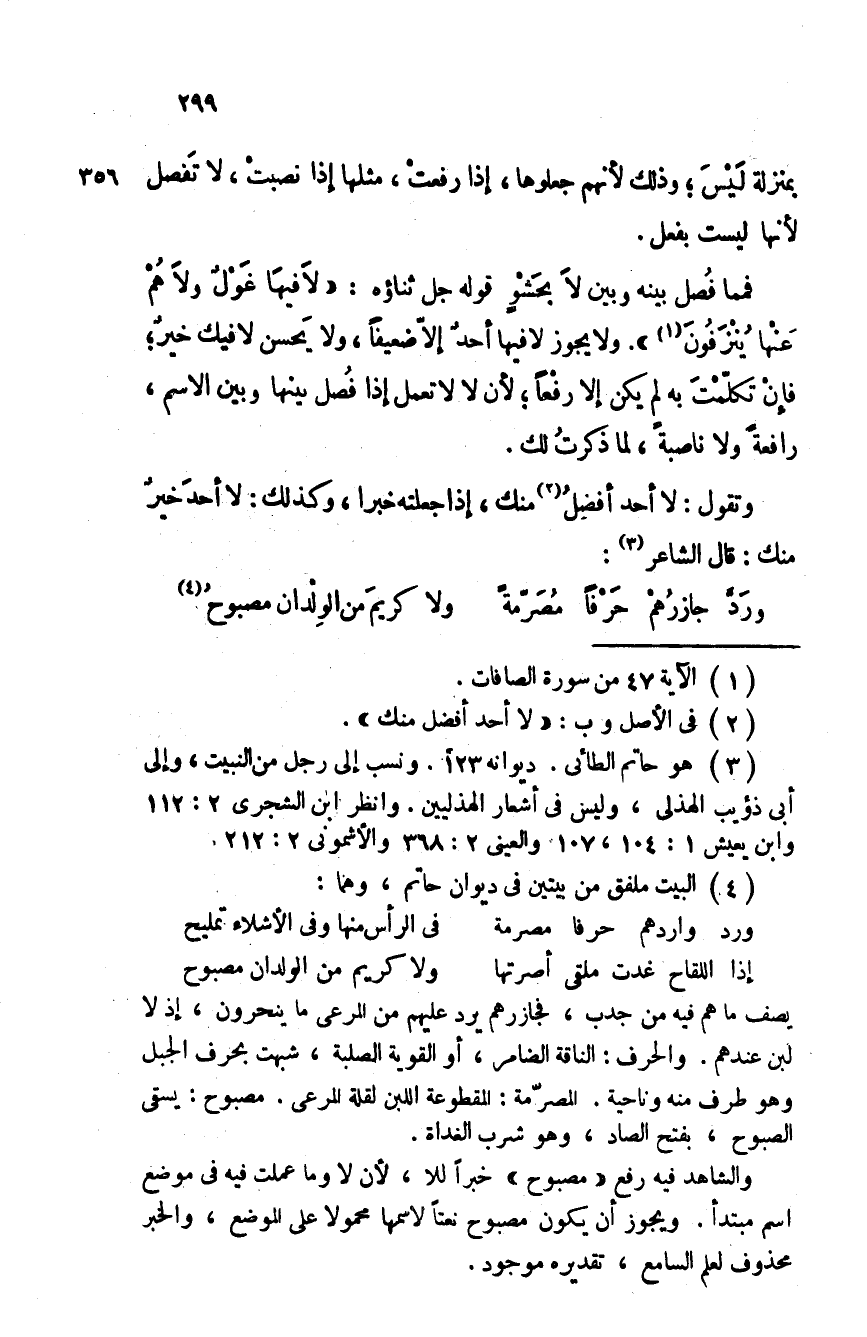 فمما فُصل بينه وبين لا بحشوٍ قوله جل ثناؤه: " لا فيها غَوْلٌ ولا هم عنها يُنزَفون ". ولا يجوز لا فيها أحد إلا ضعيفا، ولا يحسن لا فيك خيرٌ؛ فإن تكلمت به لم يكن إلا رفعا؛ لأن لا لا تعمل إذا فُصل بينها وبين الاسم، رافعة ولا ناصبة، لما ذكرت لك.
