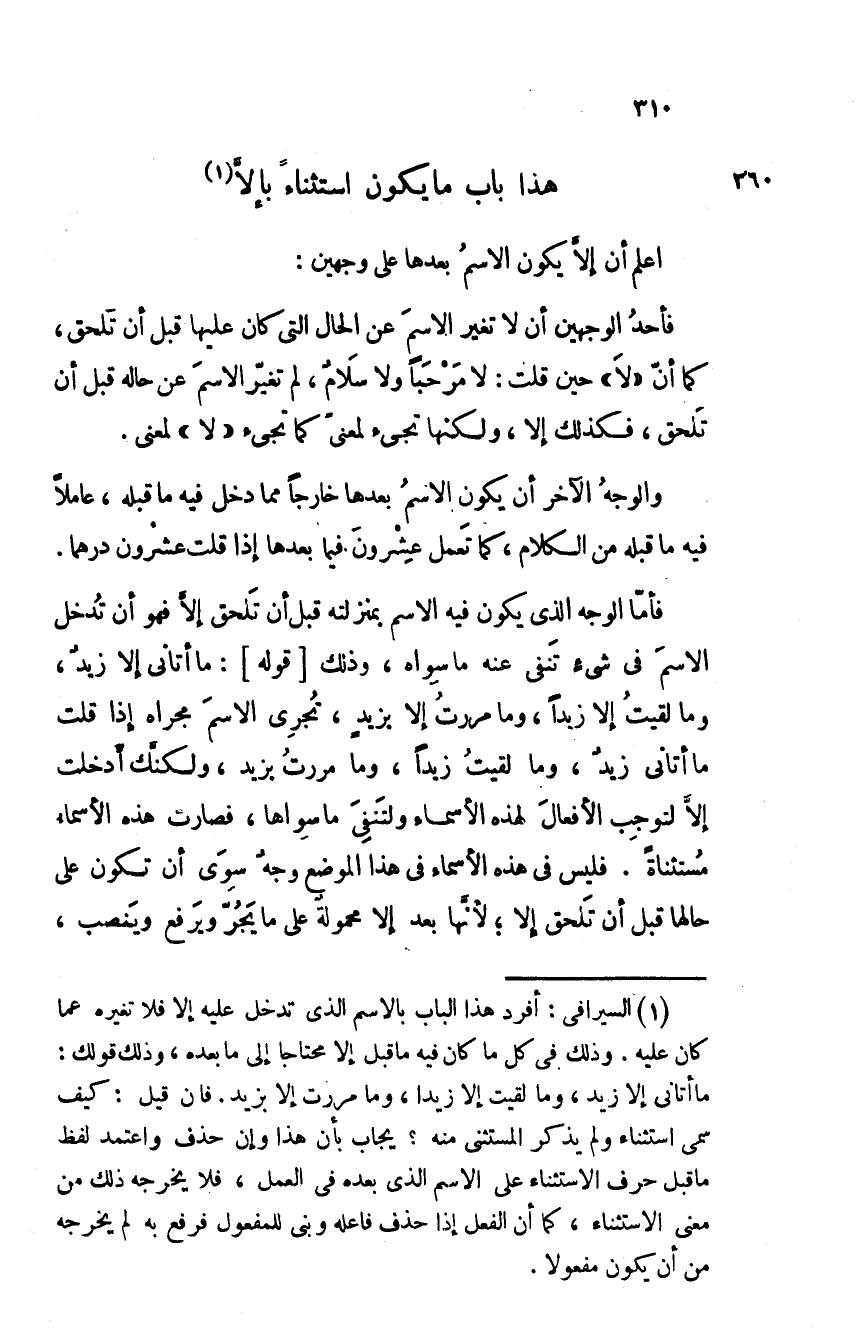 اعلم أن إلا يكون الاسم بعدها على وجهين: فأحدُ الوجهين أن لا تغير الاسم عن الحال التي كان عليها قبل أن تلحق، كما أن لا حين قلت: لا مرحبا ولا سلامٌ، لم تغير الاسم عن حاله قبل أن تلحق، فكذلك إلا، ولكنها تجيء لمعنى كما تجيء لا لمعنى.
