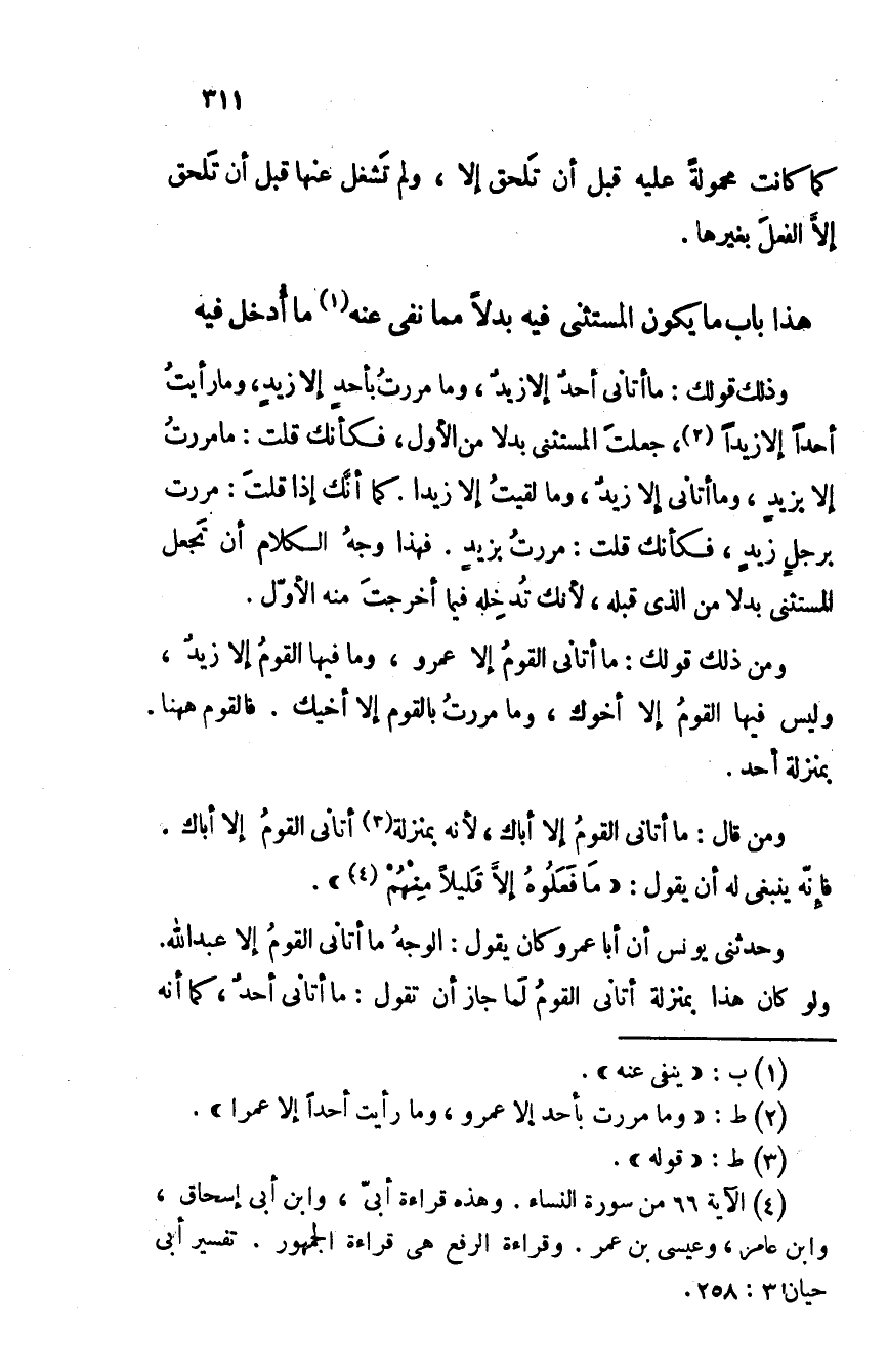 ومن ذلك قولك: ما أتاني القومُ إلا عمرو، وما فيها القومُ إلا زيدُ، وليس فيها القوم إلا أخوك، وما مررتُ بالقوم إلا أخيك. فالقوم ههنا بمنزلة أحد.