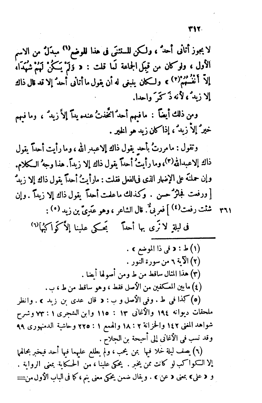 لا يجوز أتاني أحدٌ، ولكن المستثنى في هذا الموضع مبدَلٌ من الاسم الأول، ولو كان من قبل الجماعة لما قلت: " ولم يكنْ لهم شُهداءُ إلا أنفسُهُم " ولكان ينبغي له أن يقول ما أتاني أحدٌ إلا قد قال ذاك إلا زيد، لأنه ذكر واحدا.