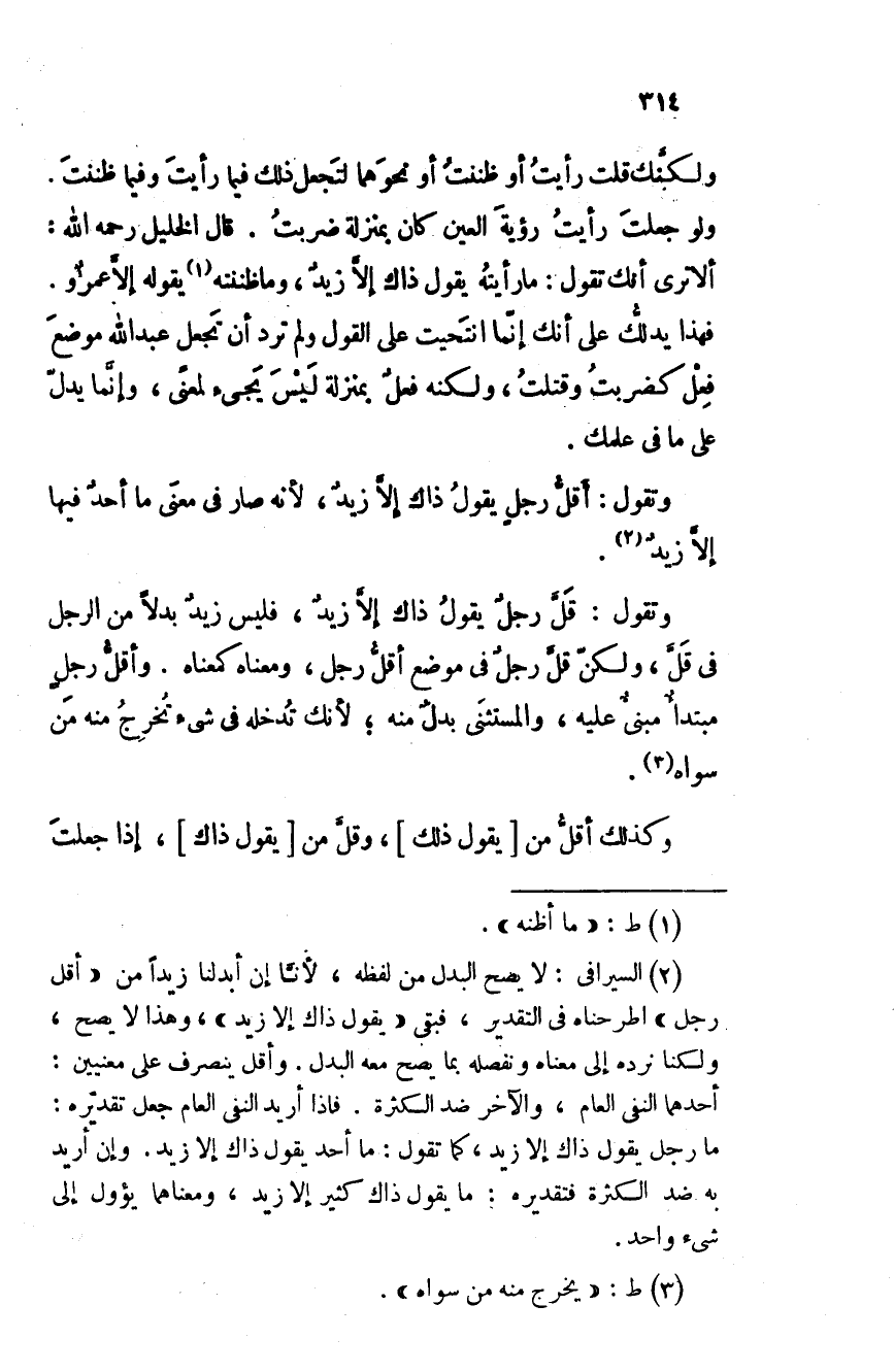 ولكنك قلت رأيتُ أو ظننت أو نحوهما لتجعل ذلك فيما رأيت وفيما ظننت. ولو جعلت رأيت رؤية العين كان بمنزلة ضربت. قال الخليل رحمه الله: ألا ترى أنك تقول: ما رأيته يقول ذاك إلا زيد، وما ظننته يقوله إلا عمرو. فهذا يدلك على أنك إنما انتحيت على القول ولم ترد أن تجعل عبد الله موضعَ فعل كضربتُ وقتلت، ولكنه فعلٌ بمنزلة ليس يجيء لمعنى، وإنما يدل على ما في علمك.