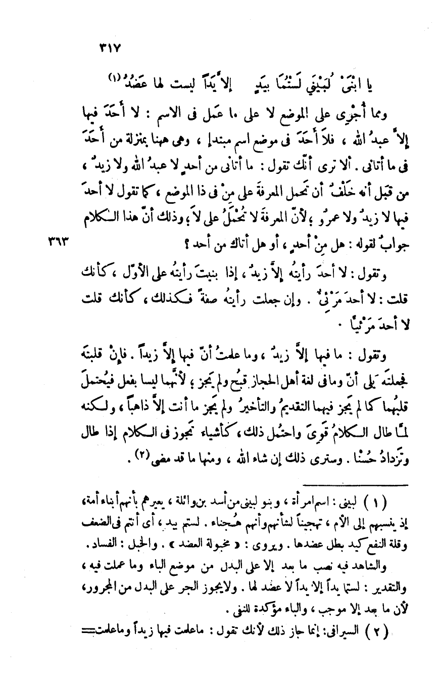 ومما أجرى على الموضع لا على ما عمل في الاسم: لا أحدَ فيها إلا عبد الله، فلا أحدَ في موضع اسم مبتدإ، وهي ههنا بمنزلة من أحدَ في ما أتاني. ألا ترى أنك تقول: ما أتاني من أحدٍ لا عبدُ الله ولا زيدٌ، من قبل أنه خلفٌ أن تحمل المعرفة على مِن في ذا الموضع، كما تقول لا أحدَ فيها لا زيدٌ ولا عمرو؛ لأن المعرفة لا تُحمل على لا؛ وذلك أن هذا الكلام جواب لقوله: هل مِن أحد، أو هل أتاك من أحد؟ وتقول: لا أحدَ رأيته إلا زيد، إذا بنيتَ رأيته على الأول، كأنك قلت: لا أحدَ مرئى. وإن جعلت رأيته صفة فكذلك، كأنك قلت لا أحدَ مرئيا.
