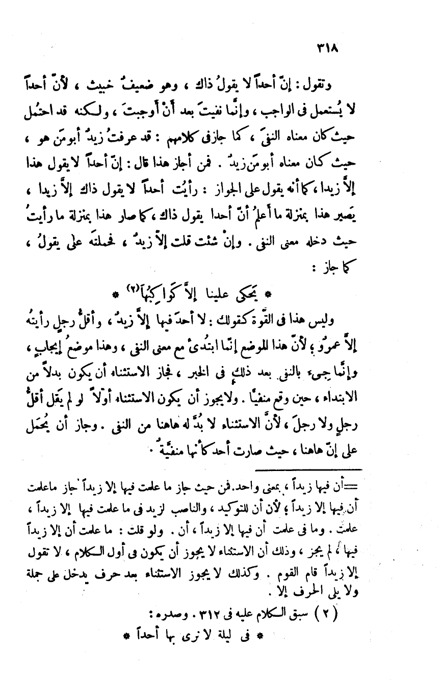 وتقول: إن أحدا لا يقول ذاك، وهو ضعيف خبيث، لأن أحدا لا يستعمل في الواجب، وإنما نفيتَ بعد أن أوجبتَ، ولكنه قد احتُمل حيث كان معناه النفي، كما جاز في كلامهم: قد عرفتُ زيدٌ أبو مَن هو، حيث كان معناه أبو مَن زيدٌ. فمن أجاز هذا قال: إن أحداً لا يقول هذا إلا زيدا، كما أنه يقول على الجواز: رأيتُ أحدا لا يقول ذاك إلا زيدا، يصير هذا بمنزلة ما أعلمُ أن أحدا يقول ذاك، كما صار هذا بمنزلة ما رأيتُ حيث دخله معنى النفي. وإن شئت قلت إلا زيدٌ، فحملته على يقول، كما جاز: يَحكى علينا إلاَّ كواكبُها وليس هذا في القوة كقولك: لا أحدَ فيها إلا زيدٌ، وأقلُّ رجلٍ رأيتُه إلا عمرو؛ لأن هذا الموضع إنما ابتُدئ مع معنى النفي، وهذا موضعُ إيجاب، وإنما جيء بالنفي بعد ذلك في الخبر، فجاز الاستثناء أن يكون بدلا من الابتداء، حين وقع منفيا. ولا يجوز أن يكون الاستثناء أولا لو لم يقل أقلُّ رجلٍ ولا رجلَ، لأن الاستثناء لابد له ها هنا من النفي. وجاز أن يُحمل على إن هاهنا، حيث صارت أحد كأنها منفية.