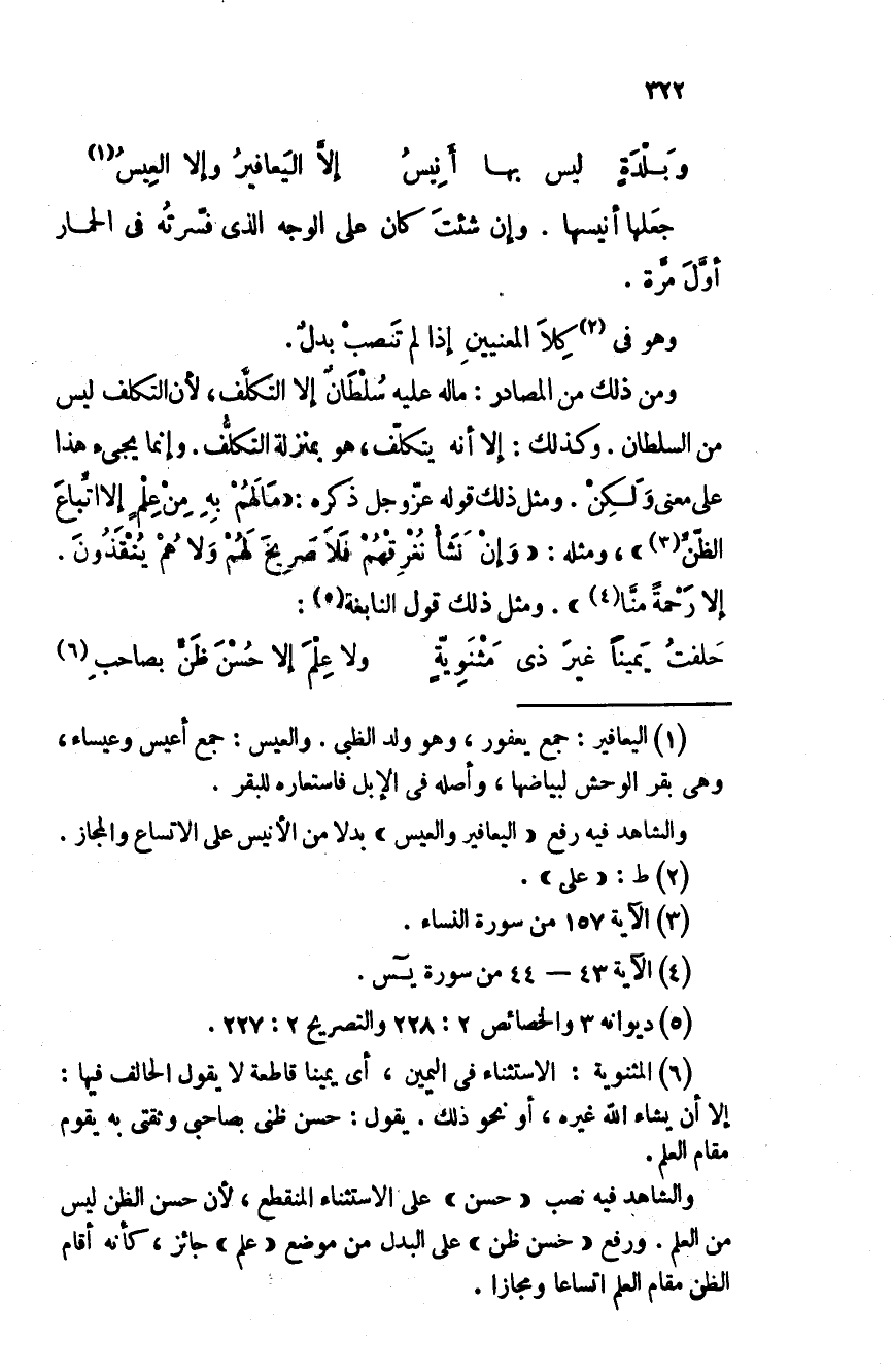 ومن ذلك من المصادر: ما له عليه سلطانٌ إلا التكلف، لأن التكلف ليس من السلطان. وكذلك: إلا أنه يتكلف، هو بمنزلة التكلف. وإنما يجيء هذا على معنى ولكنْ. ومثل ذلك قوله عز وجل ذكره: " ما لهم به من عِلمٍ إلا اتّباعَ الظن "، ومثله: " وإن نشأْ نُغرقْهُم فلا صريحَ لهم ولا هُم يُنقَذون. إلا رحمة منا ". ومثل ذلك قول النابغة: