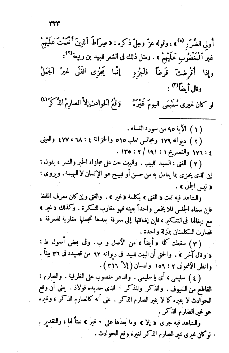 أُولىِ الضّرَر "، وقوله عز وجل ذكره: " صراطَ الذِينَ أنعمتَ عَلَيْهمْ غير المغضوبِ عَلَيْهمْ ". ومثل ذلك في الشعر للبيد بن ربيعة: