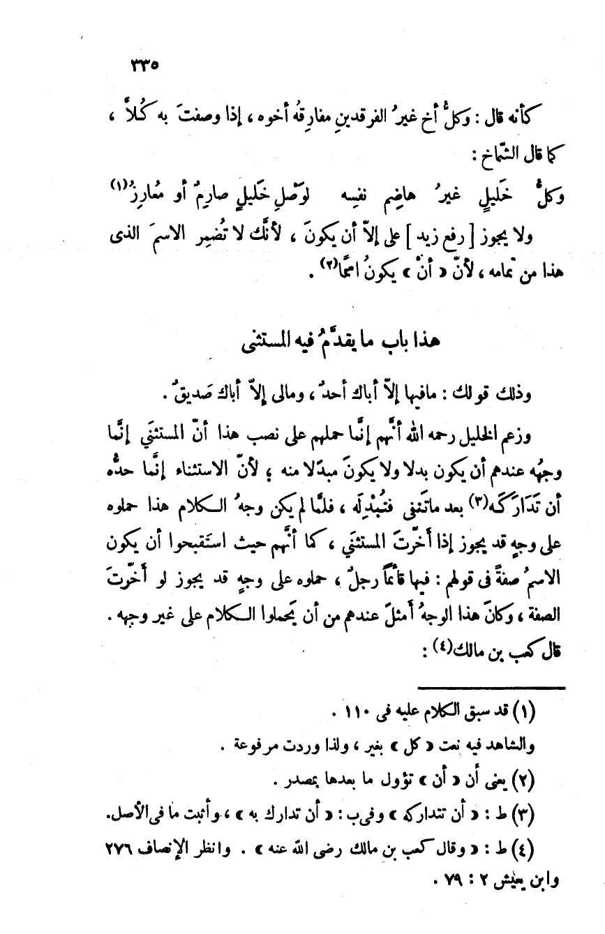 وزعم الخليل رحمه الله أنهم إنما حملهم على نصب هذا أن المستثني إنما وجهه عندهم أن يكون بدلا ولا يكون مبدَلاً منه؛ لأن الاستثناء إنما حده أن تَدارَكَه بعد ما تنفى فتُبدِله، فلما لم يكن وجه الكلام هذا حملوه على وجه قد يجوز إذا أخّرتَ المستثني، كما أنهم حيث استقبحوا أن يكون الاسم صفة في قولهم: فيها قائما رجلٌ، حملوه على وجه قد يجوز لو أخّرتَ الصفة، وكان هذا الوجهُ أمثلَ عندهم من أن يحملوا الكلام على غير وجهه. قال كعب بن مالك: