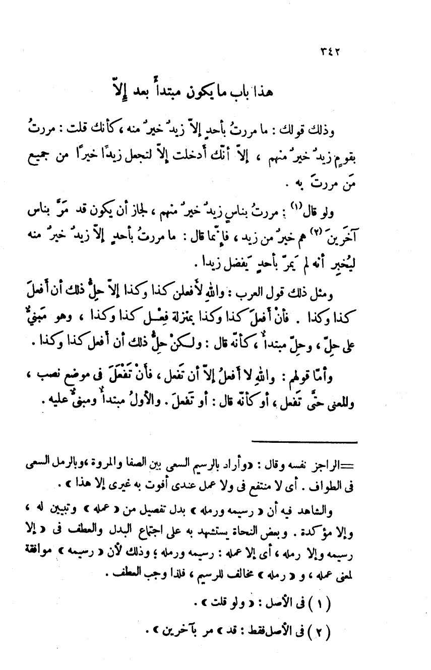 ولو قال: مررتُ بناس زيدٌ خيرٌ منهم، لجاز أن يكون قد مر بناس آخرين هم خيرٌ من زيد، فإنما قال: ما مررتُ بأحدٍ إلا زيدٌ خيرٌ منه ليخبر أنه لم يمر بأحدٍ يفضل زيدا.