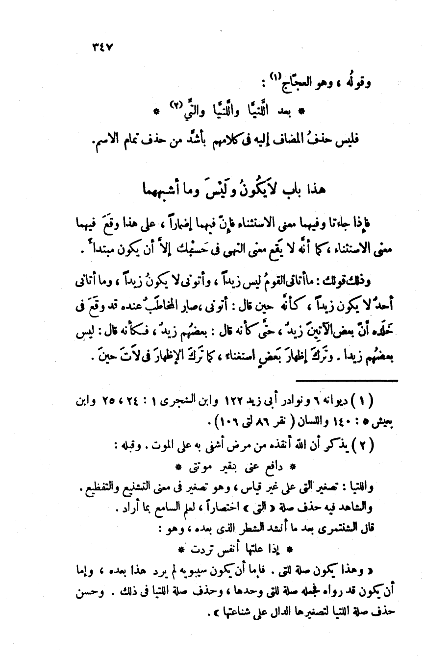 وقوله، وهو العجّاج: بعد اللَّتيّا واللّتيا والتِّي فليس حذف المضاف إليه في كلامهم بأشدّ من حذف تمام الاسم.