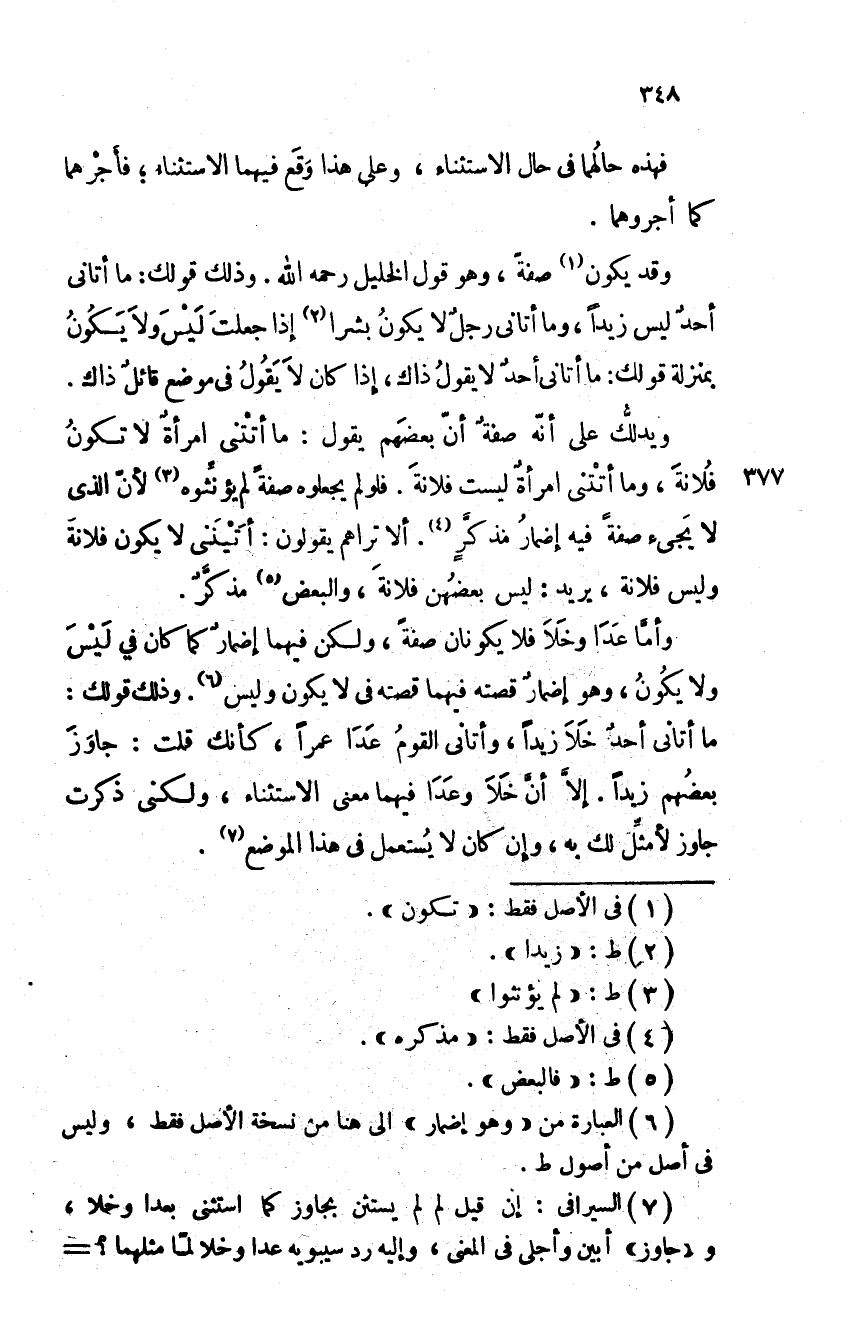 وقد يكون صفة، وهو قول الخليل رحمه الله. وذلك قولك: ما أتاني أحدٌ ليس زيدا، وما أتاني رجل لا يكون بشرا إذا جعلت ليس ولا يكون بمنزلة قولك: ما أتاني أحدٌ لا يقول ذاك، إذا كان لا يقول في موضع قائلٌ ذاك.