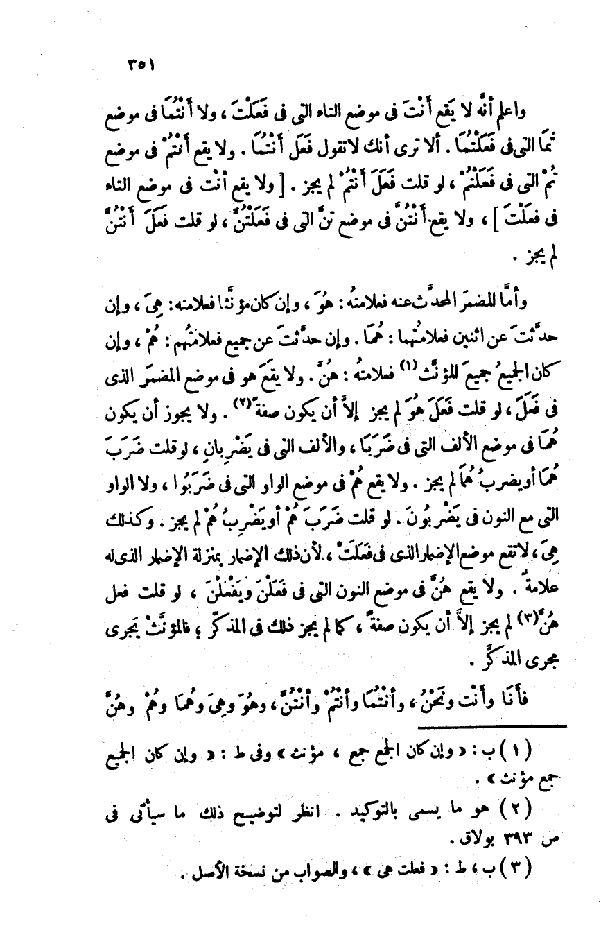 واعلم أنه لا يقع أنتَ في موضع التاء التي في فعَلْتَ، ولا أنتما في موضع تُما التي في فعلتُما. ألا ترى أنك لا تقول فعل أنتُما. ولا يقع أنتم في موضع تُمْ التي في فعلتُم، لو قلت فعل أنتم لم يجز. ولا يقع أنت في موضع التاء في فعلْتَ، ولا يقع أنتُنّ في موضع تنَّ التي في فعلتُنّ، لو قلت فعلَ أنتُنّ لم يجز.