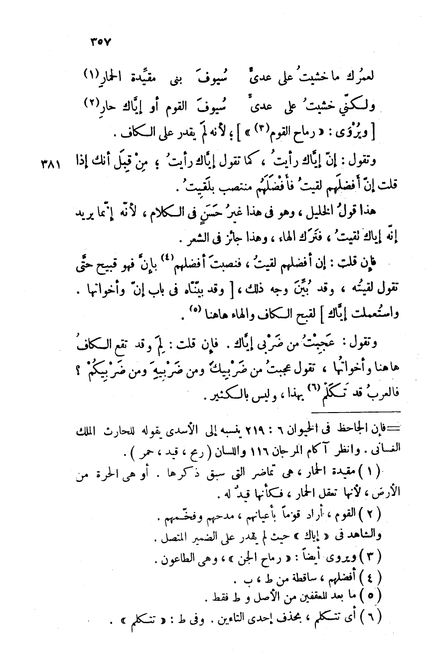 وتقول: عجبتُ من ضربي إياك. فإن قلت: لِمَ وقد تقع الكاف ها هنا وأخواتها، تقول عجبتُ من ضربيكَ ومن ضربيه ومن ضربيكم؟ فالعرب قد تكلم بهذا، وليس بالكثير.