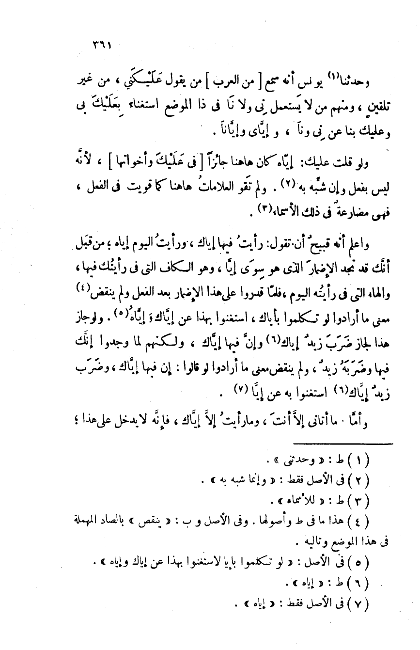وحدثنا يونس أنه سمع من العرب من يقول عليكَني، من غير تلقين، ومنهم من لا يستعمل نى ولا نا في ذا الموضع استغناء بعليك بي وعليك بنا عن نى ونا، وإياى وإيانا.