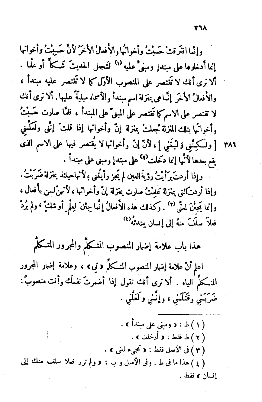 اعلم أن علامة إضمار المنصوب المتكلم نى، وعلامة إضمار المجرور المتكلم الياء. ألا ترى أنك تقول إذا أضمرتَ نفسك وأنت منصوب: ضربني وقتلني، وإنني ولعلني.