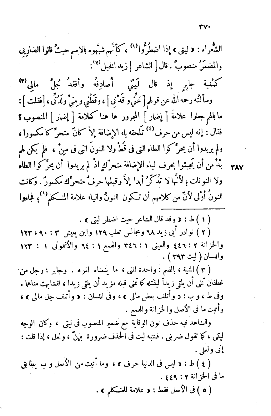 الشعراء: ليتى إذا اضطروا، كأنهم شبهوه بالاسم حيث قالوا الضاربى والمضمَر منصوب. قال الشاعر زيد الخليل: