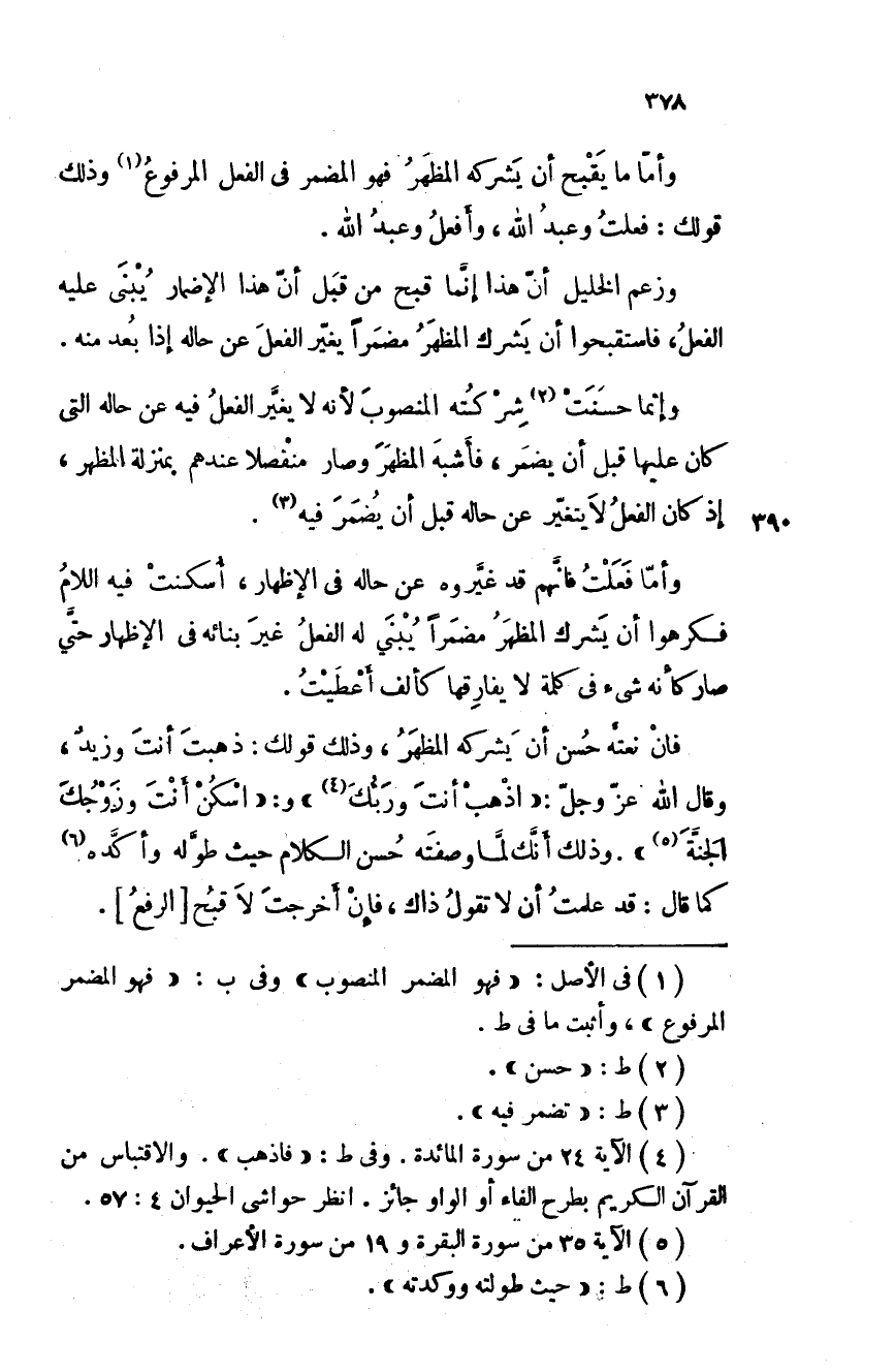 وزعم الخليل أن هذا إنما قبح من قبل أن هذا الإضمار يُبنى عليه الفعل، فاستقبحوا أن يشرك المظهر مضمَراً يغير الفعل عن حاله إذا بعد منه.