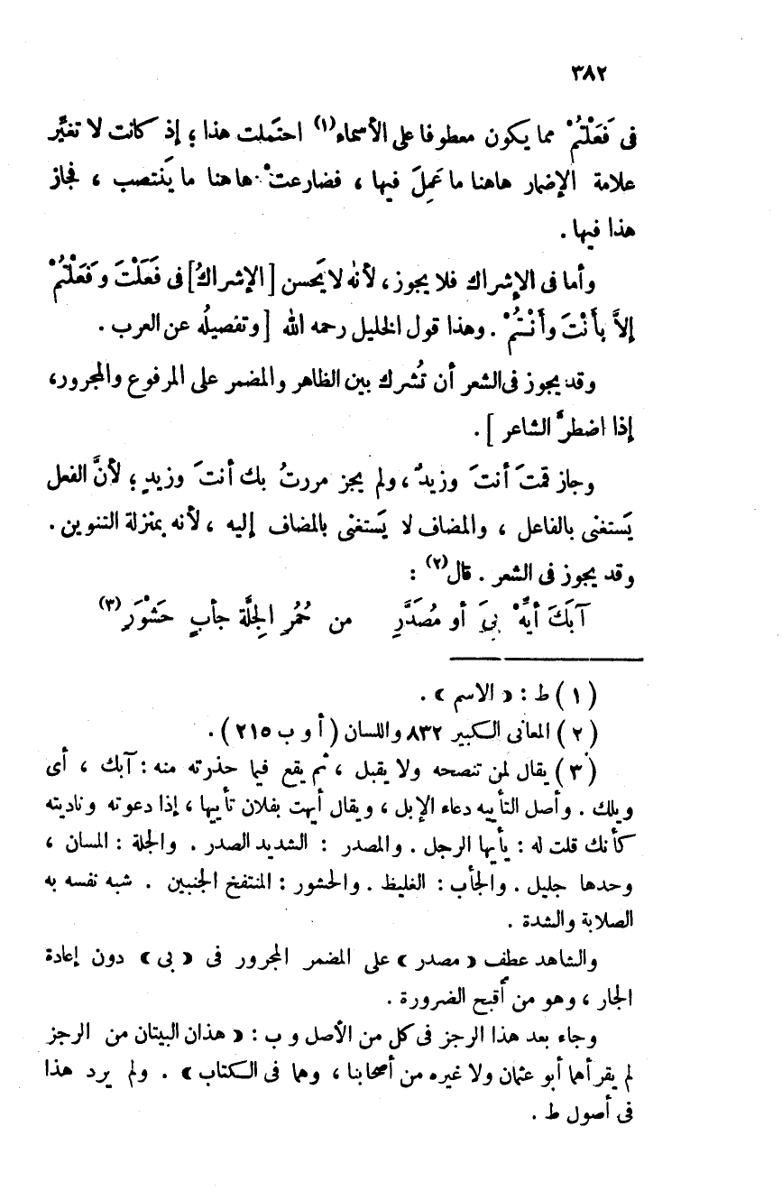 وأما في الإشراك فلا يجوز، لأنه لا يحسن الإشراكُ في فعلتَ وفعلتُم إلا بأنت وأنتم. وهذا قول الخليل رحمه الله وتفصيله عن العرب.