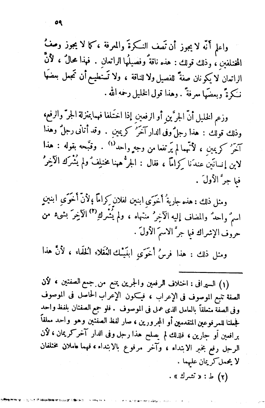 واعلم أنه لا يجوز أن تصف النكرة والمعرفة، كما لا يجوز وصفُ المختلفين، وذلك قولك: هذه ناقة وفصيلها الراتعان. فهذا محال، لأن الراتعان لا يكونان صفة للفصيل ولا للناقة، ولا تستطيع أن تجعل بعضَها نكرة وبعضَها معرفة. وهذا قول الخليل رحمه الله.
