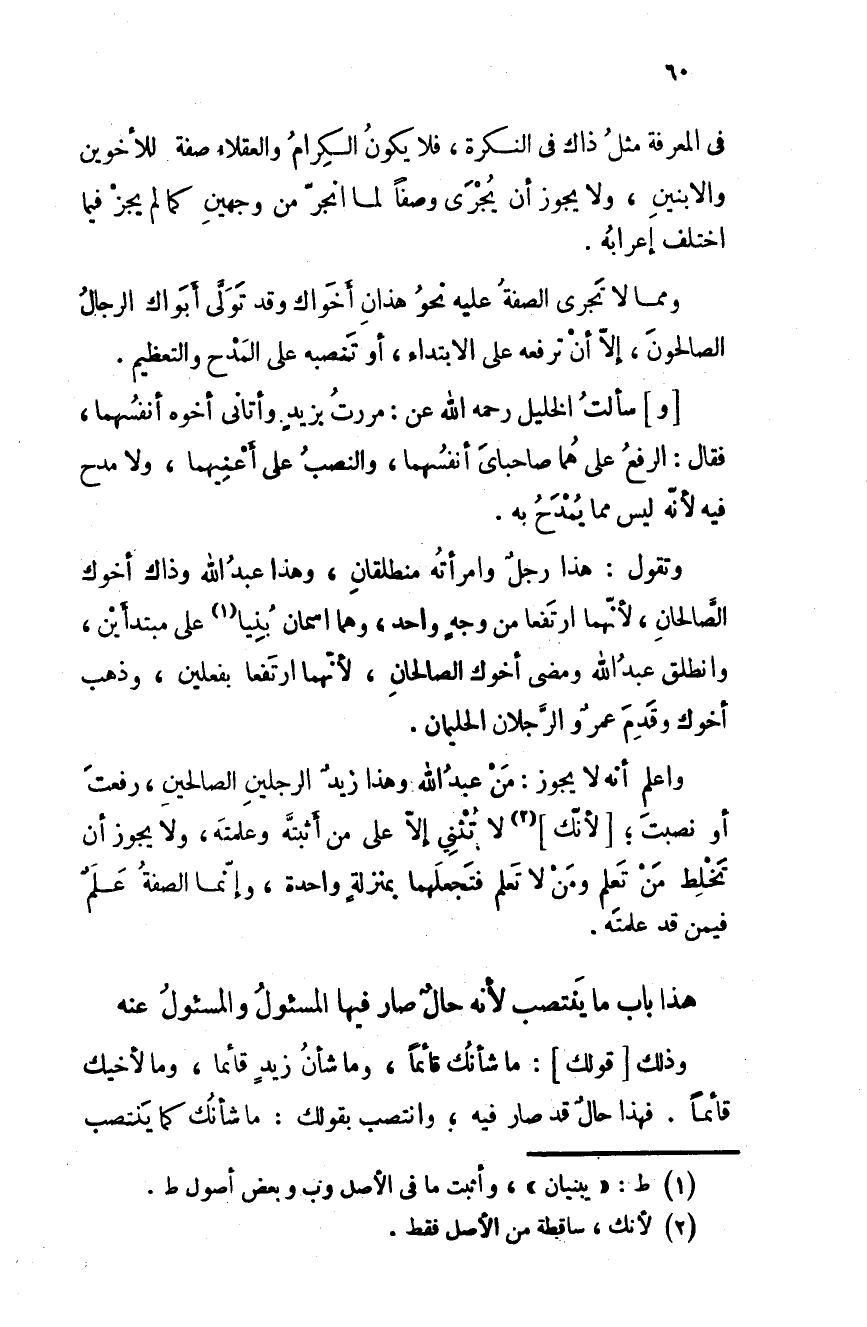 واعلم أنه لا يجوز: مَن عبد الله وهذا زيدٌ الرجلين الصالحين، رفعتَ أو نصبتَ؛ لأنك لا تُثني إلا على من أثبته وعلمتَه، ولا يجوز أن تَخلِط من تعلم ومن لا تعلم فتجعلهما بمنزلة واحدة، وإنما الصفة علَمٌ فيمن قد علمتَه.