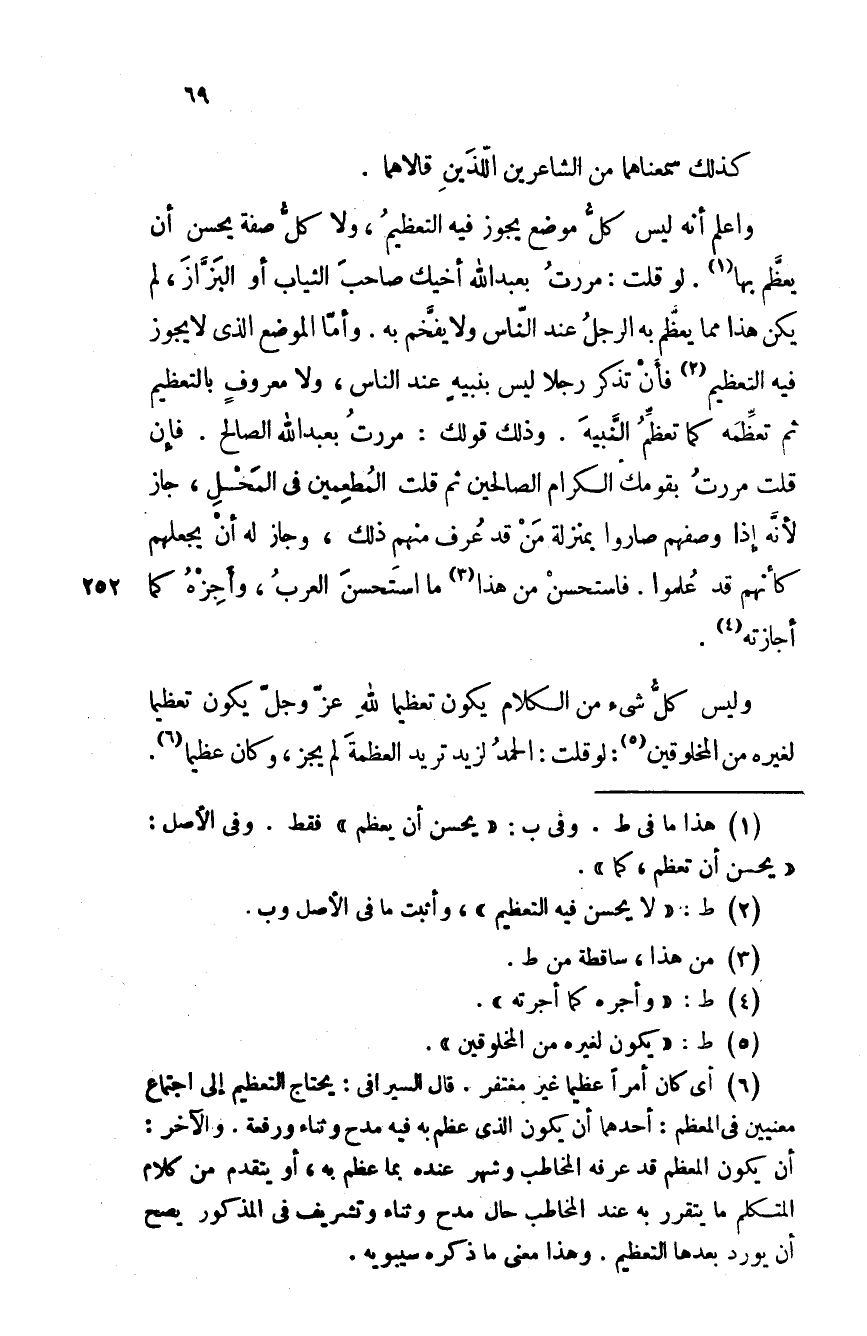 واعلم أنه ليس كل موضع يجوز فيه التعظيم، ولا كل صفة يحسن أن يعظَّم بها. لو قلت: مررت بعبد الله أخيك صاحبَ الثياب أو البزّاز، لم يكن هذا مما يعظَّم به الرجل عند الناس ولا يفخَّم به. وأما الموضع الذي لا يجوز فيه التعظيم فأن تذكر رجلاً بنبيهٍ عند الناس، ولا معروفٍ بالتعظيم ثم تعظمه كما تعظم النبيه. وذلك قولك: مررت بعبد الله الصالح. فإن قلت مررت بقومك الكرام الصالحين ثم قلت المُطعِمين في المَحل، جاز لأنه إذا وصفهم صاروا بمنزلة من قد عُرف منهم ذلك، وجاز له أن يجعلهم كأنه قد عُلموا. فاستحسن من هذا ما استحسن العربُ، وأجِزْه كما أجازته.