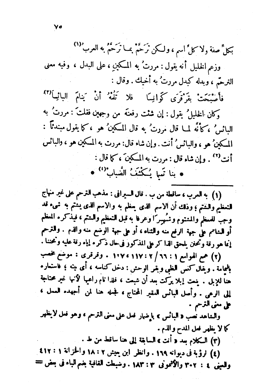 وكان الخليل يقول: إن شئت رفعته من وجهين فقلت: مررت به البائس، كأنه لما قال مررت به قال المسكين هو، كما يقول مبتدئا: المسكين هو، والبائس أنت. وإن شاء قال: مررت به المسكين هو، والبائس أنت. وإن شاء قال: مررت به المسكين، كما قال: بنا تماماً يُكشَف الضّبابْ