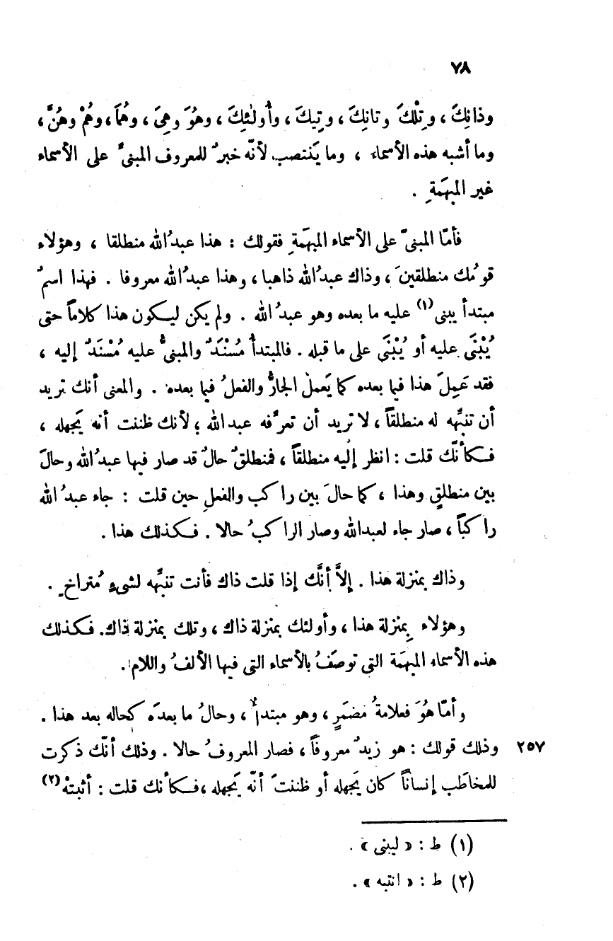 فأما المبني على الأسماء المبهمة فقولك: هذا عبد الله منطلقا، وهؤلاء قومك منطلقين، وذاك عبد الله ذاهبا، وهذا عبد الله معروفاً. فهذا اسمٌ مبتدأ يبنى عليه ما بعده وهو عبد الله. ولم يكن ليكون هذا كلاما حتى يُبنى عليه أو يبنى على ما قبله. فالمبتدأ مُسند والمبنى عليه مسند إليه، فقد عمل هذا فيما بعده كما يعمل الجار والفعل فيما بعده. والمعنى أنك تريد أن تنبهه له منطلقا، لا تريد أن تعرفه عبد الله؛ لأنك ظننت أنه يجهله، فكأنك قلت: انظر إليه منطلقا، فمنطلقٌ حالٌ قد صار فيها عبد الله وحالَ بين منطلق وهذا، كما حال بين راكب والفعل حين قلت: جاء عبد الله راكبا، صار لعبد الله وصار الراكب حالا. فكذلك هذا.