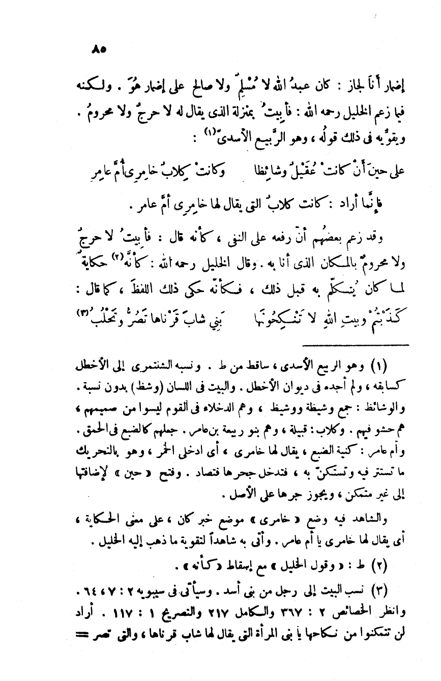 إضمار أنا لجاز: كان عبد الله لا مسلمٌ ولا صالح على إضمار هو. ولكنه فيما زعم الخليل رحمه الله: فأبيت بمنزلة الذي يقال لا حرجٌ ولا محروم. ويقويه في ذلك قوله، وهو الربيع الأسدى: