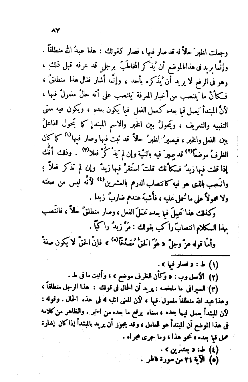 وجعلت الخبر حالا له قد صار فيها، فصار كقولك: هذا عبد الله منطلقا. وإنما يريد في هذا الموضع أن يُذكَر المخاطَب برجلٍ قد عرفه قبل ذلك، وهو في الرفع لا يريد أن يُذكره بأحد، وإنما أشار فقال هذا منطلقٌ، فكأن ما ينتصب من أخبار المعرفة ينتصب على أنه حالٌ مفعول فيها، لأن المبتدأ يعمل فيما بعده كعمل الفعل فيما يكون بعده، ويكن فيه معنى التنبيه والتعريف، ويحولُ بين الخبر والاسم المبتدإ كما يحول الفاعل بين الفعل والخبر، فيصير الخبر حالا قد ثبت فيها وصار فيها كما كان الظرف موضعا قد صِيرَ فيه بالنية وإن لم يذكر فعلا. وذلك أنك إذا قلت فيها زيدٌ فكأنك قلت استقر فيها زيد وإن لم تذكر فعلاً؛ والنصب بالذى هو فيه كانتصاب الدرهم بالعشرين لأنه ليس من صفته ولا محمولا على ما حُمل عليه، فأشبه عندهم ضاربٌ زيدا.
