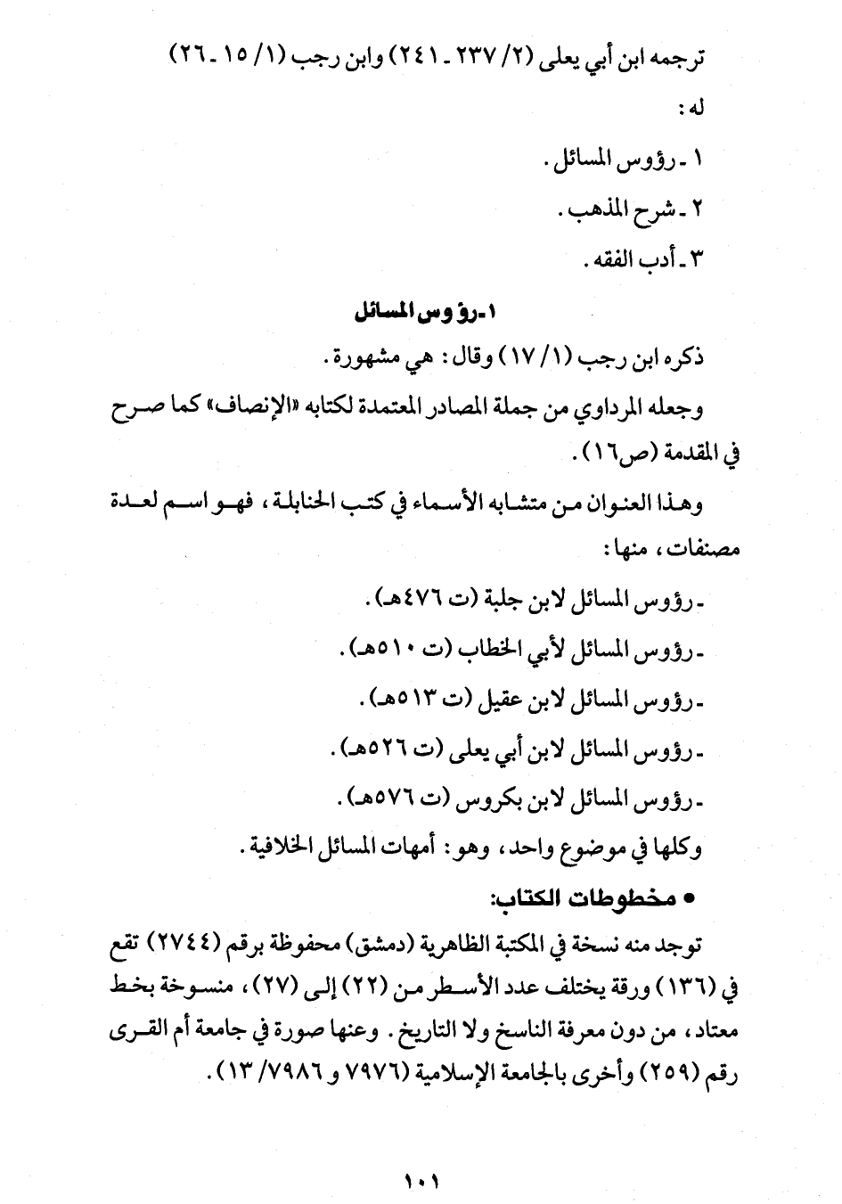 - رؤوس المسائل لإبن أبي يعلى (ت 526 هـ).
