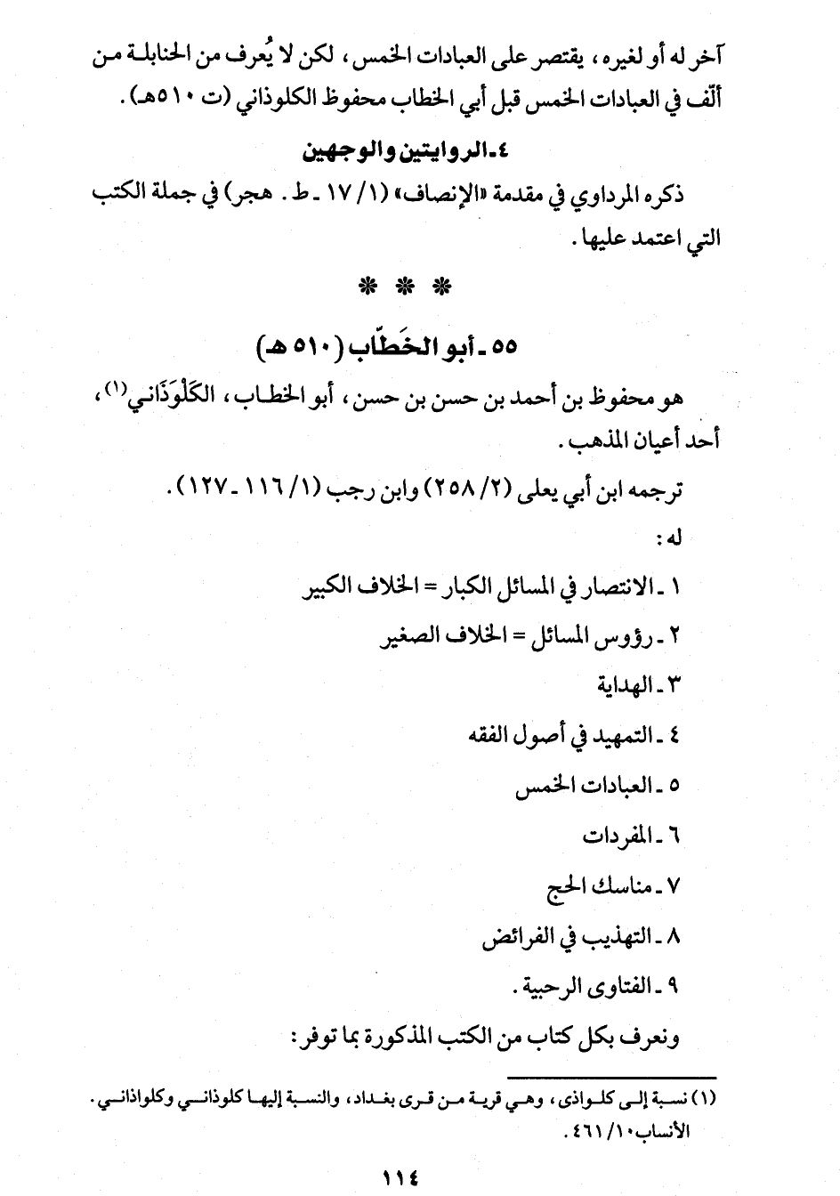 آخر له أو لغيره، يقتصر على العبادات الخمس، لكن لا يُعرف من الحنابلة من ألّف في العبادات الخمس قبل أبي الخطاب محفوظ الكلوذاني (ت 510 هـ).