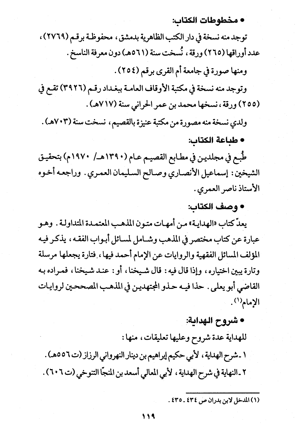 يعدّ كتاب "الهداية" من أمهات متون المذهب المعتمدة المتداولة. وهو عبارة عن كتاب مختصر في المذهب وشامل لمسائل أبواب الفقه، يذكر فيه المؤلف المسائل الفقهية والروايات عن الإمام أحمد فيها، فتارة يجعلها مرسلة وتارة يبين اختياره، وإذا قال فيه: قال شيخنا، أو: عند شيخنا، فمراده به القاضي أبو يعلى. حذا فيه حذو المجتهدين في المذهب المصححين لروايات الإمام (¬1).