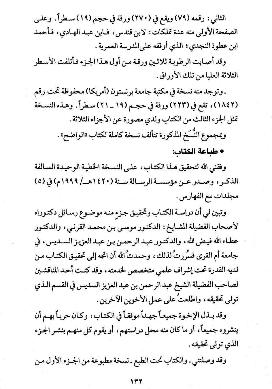وتبين لي أن دراسة الكتاب وتحقيق جزءٍ منه موضوع رسائل دكتوراه لأصحاب الفضيلة المشايخ: الدكتور موسى بن محمد القرني، والدكتور عطاء الله فيض الله، والدكتور عبد الرحمن بن عبد العزيز السديس، في جامعة أم القرى فسُررتُ لذلك، وحمدتُ الله أن اتجه إلى تحقيق الكتاب من لديه القدرة تحت إشراف علمي متخصص لخدمته، وقد كنت أحد المناقشين لصاحب الفضيلة الشيخ عبد الرحمن بن عبد العزيز السديس في القسم الذي تولى تحقيقه، واطلعتُ على عمل الأخوين الآخرين.