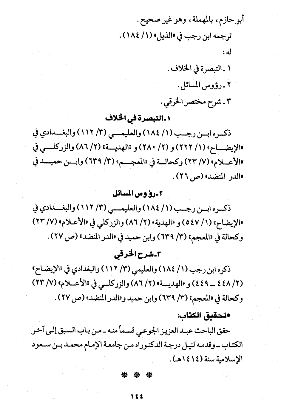 ذكره ابن رجب (1/ 184) والعليمي (3/ 112) والبغدادي في "الإيضاح" (1/ 222) و (2/ 280) و"الهدية" (2/ 86) والزركلي في "الأعلام" (7/ 23) وكحالة فى"المعجم" (3/ 639) وابن حميد في "الدر المنضد" (ص 26).