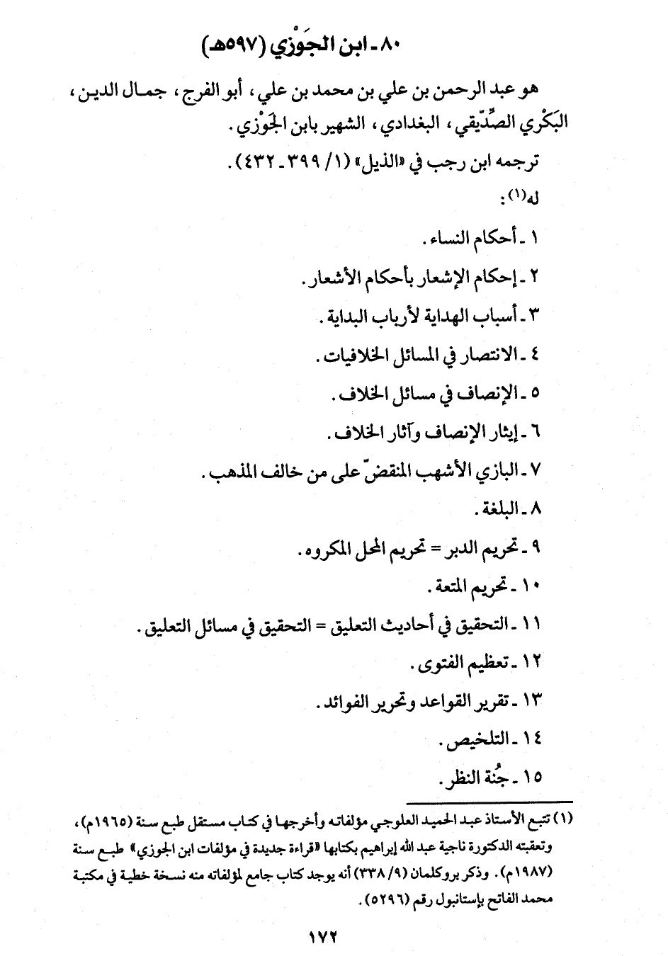 (¬1) تتبع الأستاذ عبد الحميد العلوجي مؤلفاته وأخرجها في كتاب مستقل طُبع سنة (1965 م)، وتعقبته الدكتورة ناجية عبد الله إبراهيم بكتابها "قراءة جديدة في مؤلفات ابن الجوزي" طُبع سنة (1987 م). وذكر بروكلمان (9/ 338) أنه يوجد كتاب جامع لمؤلفاته منه نسخة خطية فى مكتبة محمد الفاتح بإستانبول رقم (5296).