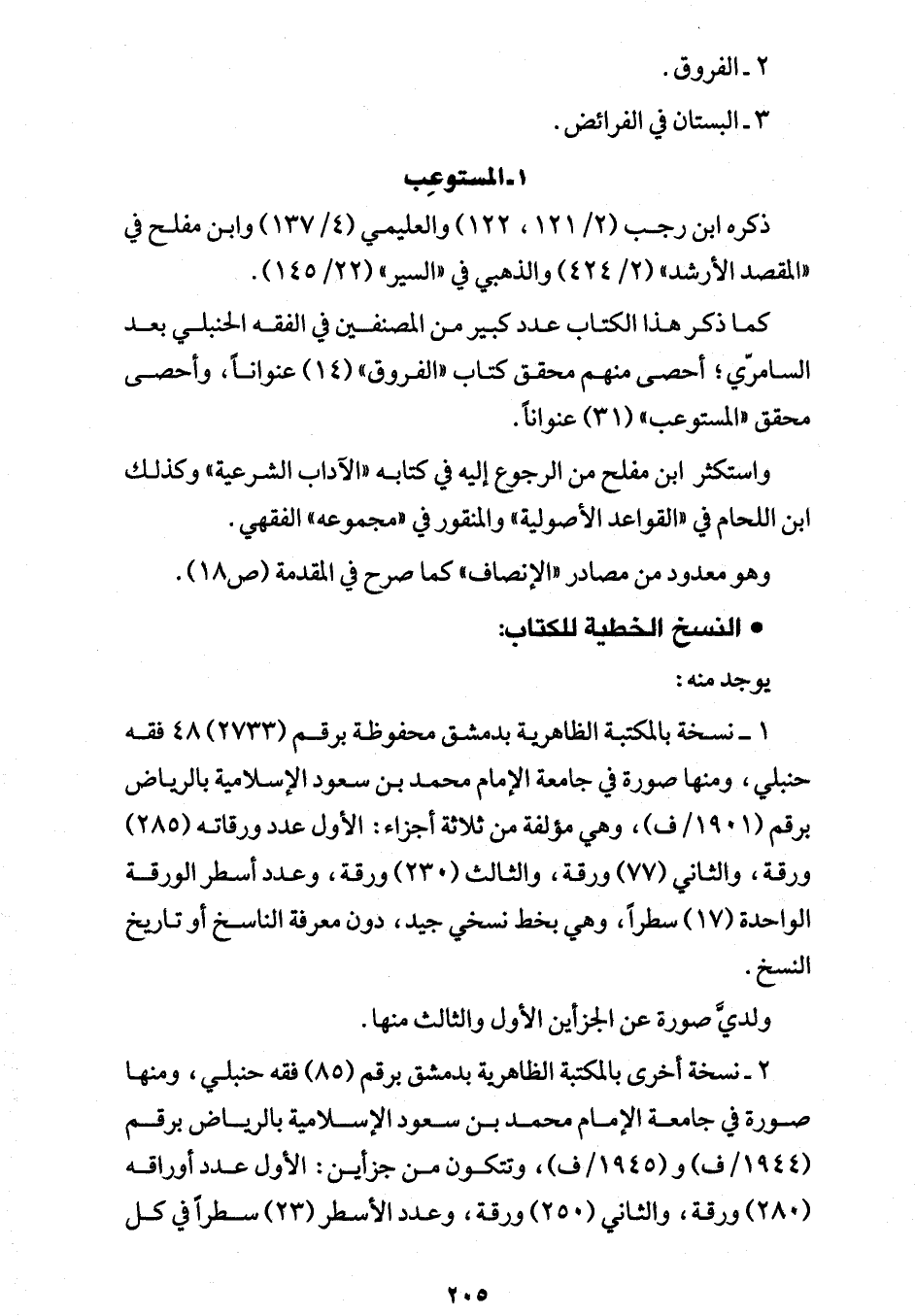 2 - نسخة أخرى بالمكتبة الظاهرية بدمشق برقم (85) فقه حنبلي، ومنها صورة في جامعة الإمام محمد بن سعود الإسلامية بالرياض برقم (1944/ ف) و (1945/ ف)، وتتكون من جزأين: الأول عدد أوراقه (280) ورقة، والثاني (250) ورقة، وعدد الأسطر (23) سطرًا في كل