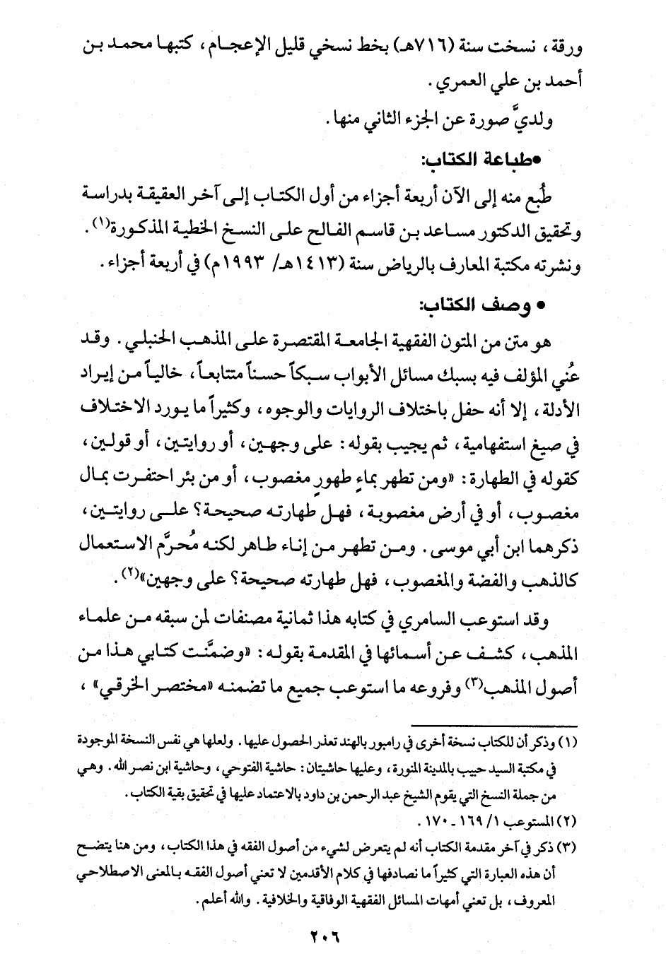 (¬3) ذكر في آخر مقدمة الكتاب أنه لم يتعرض لشيء من أصول الفقه في هذا الكتاب، ومن هنا يتضح أن هذه العبارة التي كثيرًا ما نصادفها في كلام الأقدمين لا تعني أصول الفقه بالمعنى الإصطلاحي المعروف، بل تعني أمهات المسائل الفقهية الوفاقية والخلافية. والله أعلم.