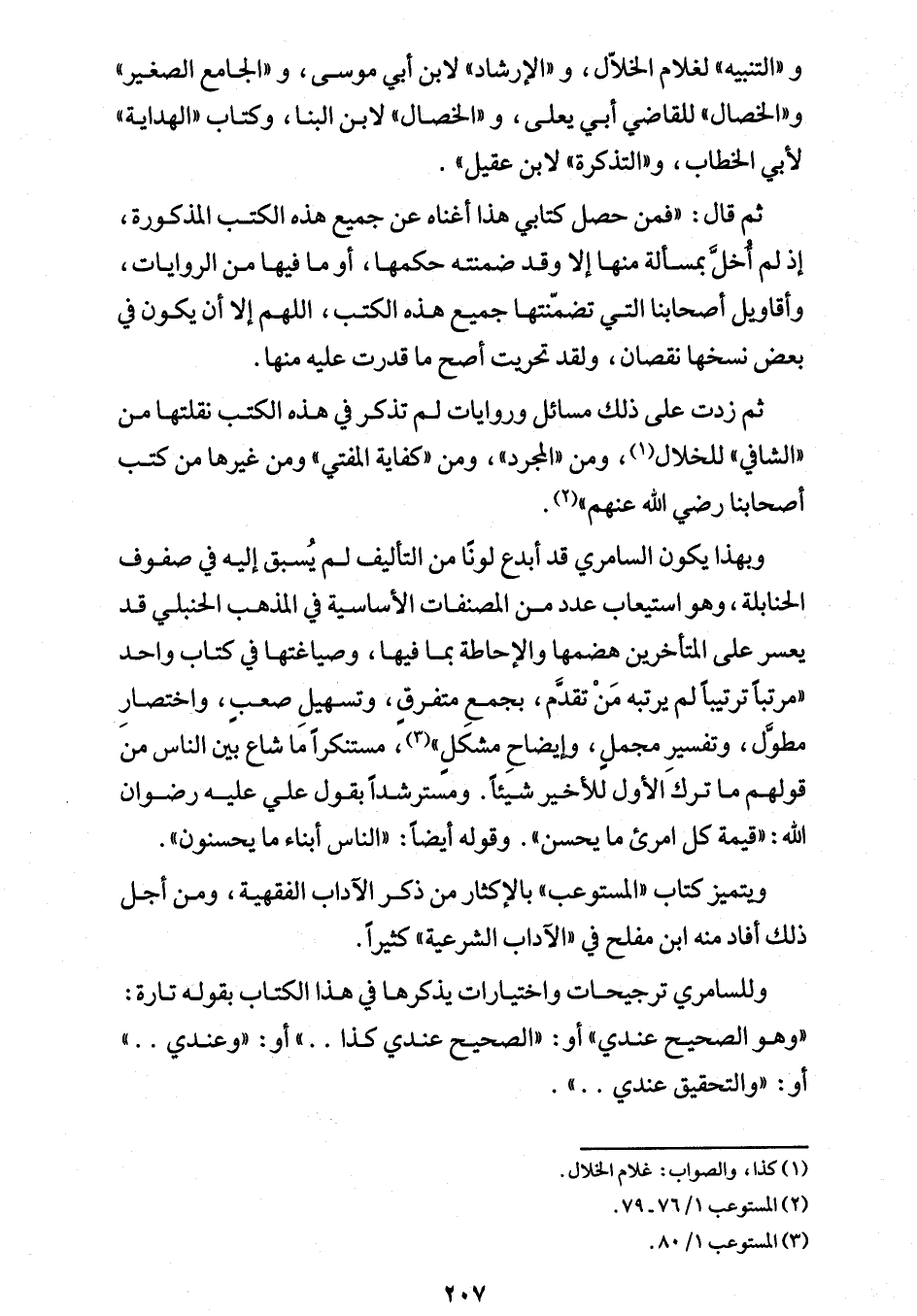 وبهذا يكون السامري قد أبدع لونًا من التأليف لم يُسبق إليه في صفوف الحنابلة، وهو استيعاب عدد من المصنفات الأساسية في المذهب الحنبلي قد يعسر على المتأخرين هضمها والإحاطة بما فيها، وصياغتها في كتاب واحد "مرتبًا ترتيبًا لم يرتبه مَنْ تقدَّم، بجمعِ متفرقٍ، وتسهيلِ صعبٍ، واختصارِ مطوَّل، وتفسيرِ مجملٍ، وإيضاحِ مشكلٍ" (¬3)، مستنكرًا ما شاع بين الناس من قولهم ما تركَ الأول للأخير شيئًا. ومسترشدًا بقول علي عليه رضوان الله: "قيمة كل امرئ ما يحسن". وقوله أيضًا: "الناس أبناء ما يحسنون".